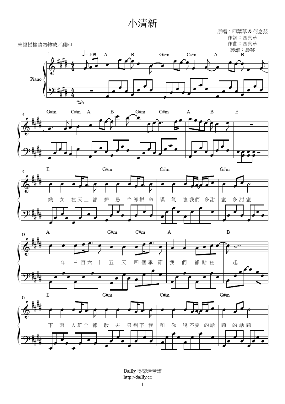 2017 由四葉草與何念茲兩位馬來西亞女歌手合唱的歌曲「小清新」鋼琴譜。