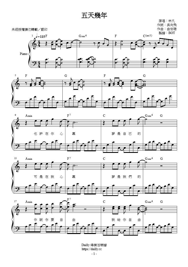 琴譜名稱:林凡-五天幾年 鋼琴譜
