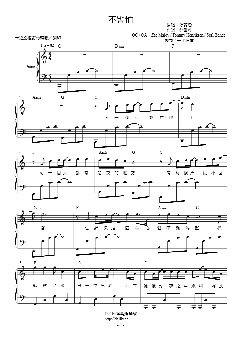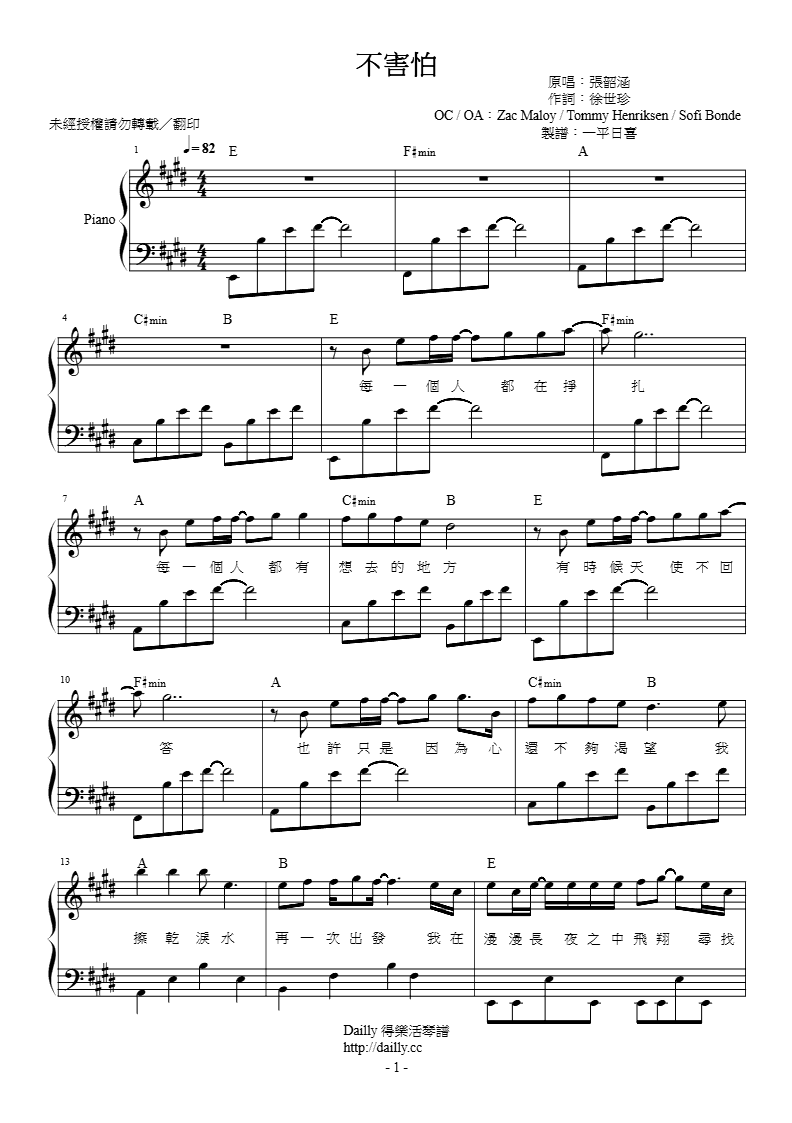 「不害怕」鋼琴譜在 Dailly 得樂活全台首發,快來搶先下載!