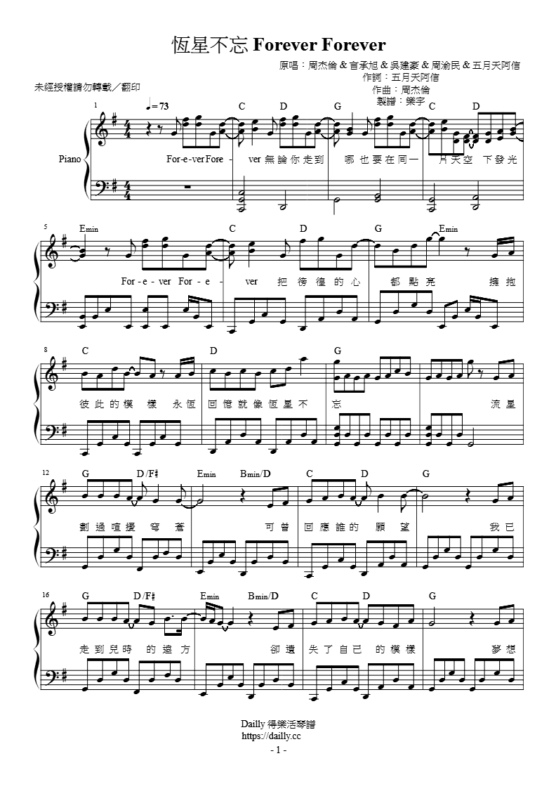 琴譜名稱:周杰倫、言承旭、吳建豪、周渝民、五月天阿信-恆星不忘 Forever Forever 鋼琴譜