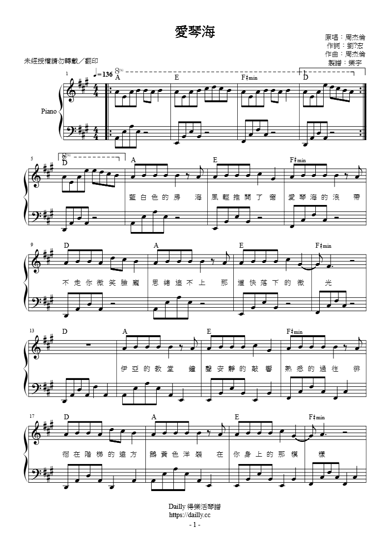 琴譜名稱:周杰倫-愛琴海 鋼琴譜