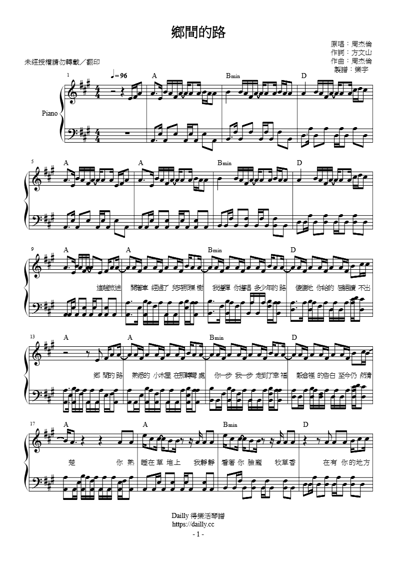 琴譜名稱:周杰倫-鄉間的路 鋼琴譜