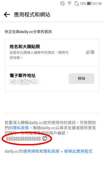 5.向下捲動,底部紅圈處的數字即是您的用戶編號,您可以用這個用戶編號來登入 Dailly 得樂活,當您順利登入後,我們
