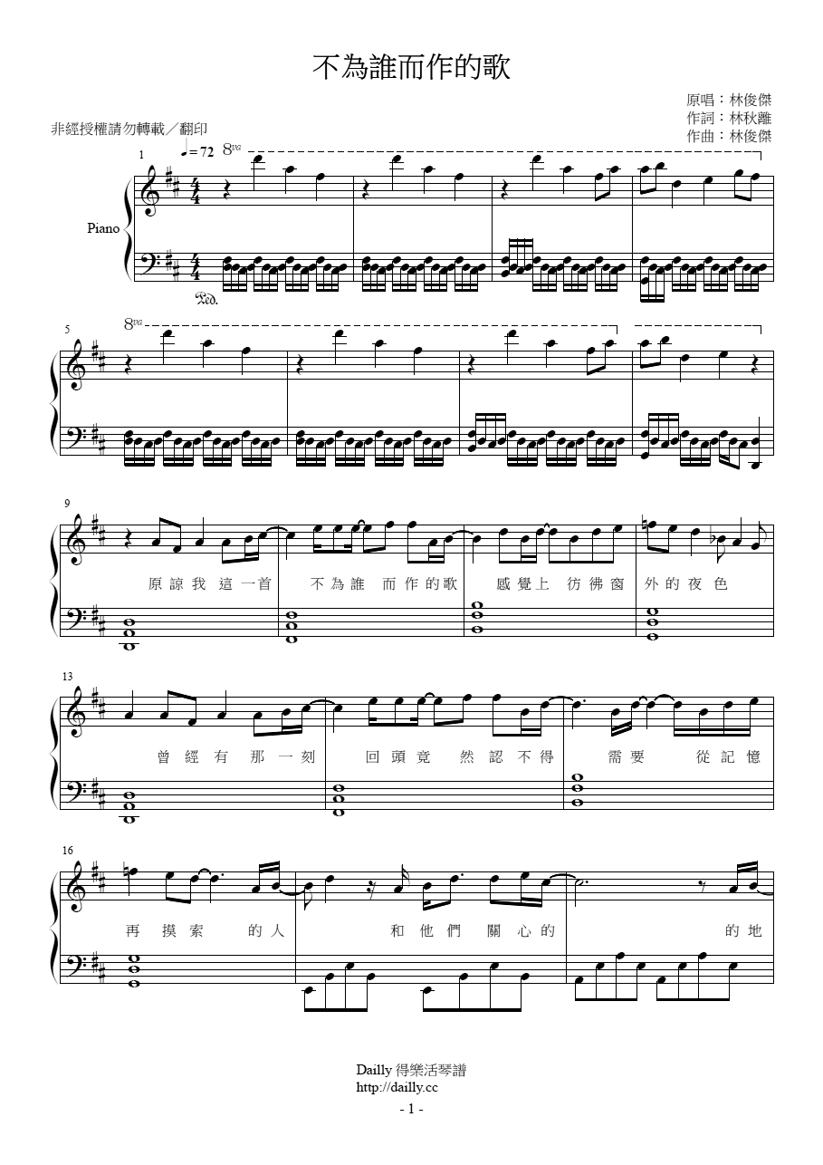 林俊傑歌曲「不為誰而作的歌」鋼琴譜,收錄於 2015「和自己對話」專輯,