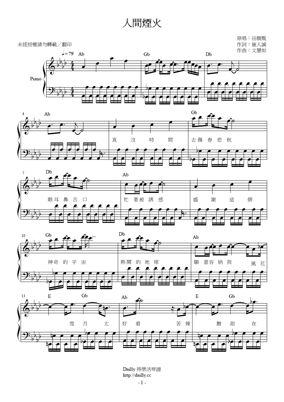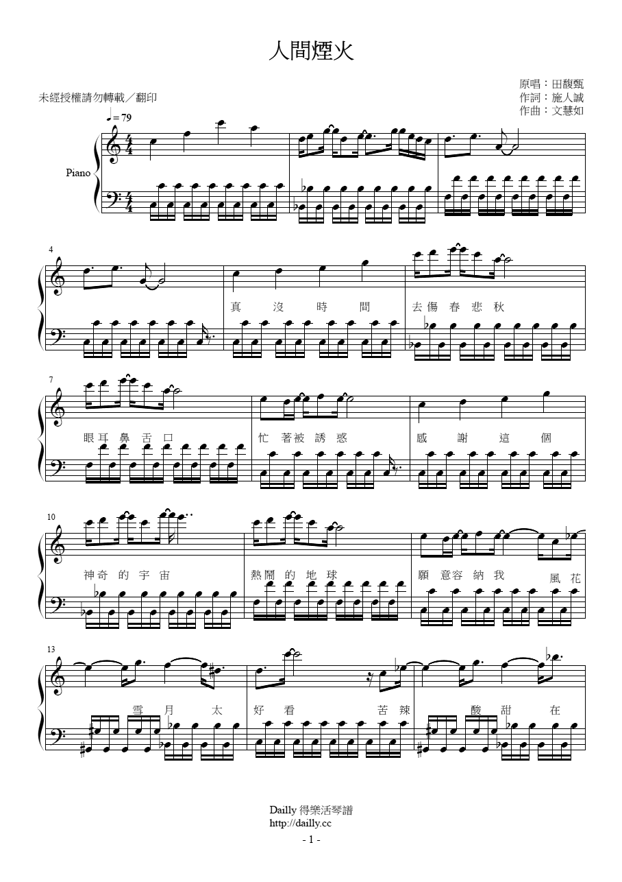 「人間煙火」鋼琴譜現已可在 Dailly 得樂活下載。
