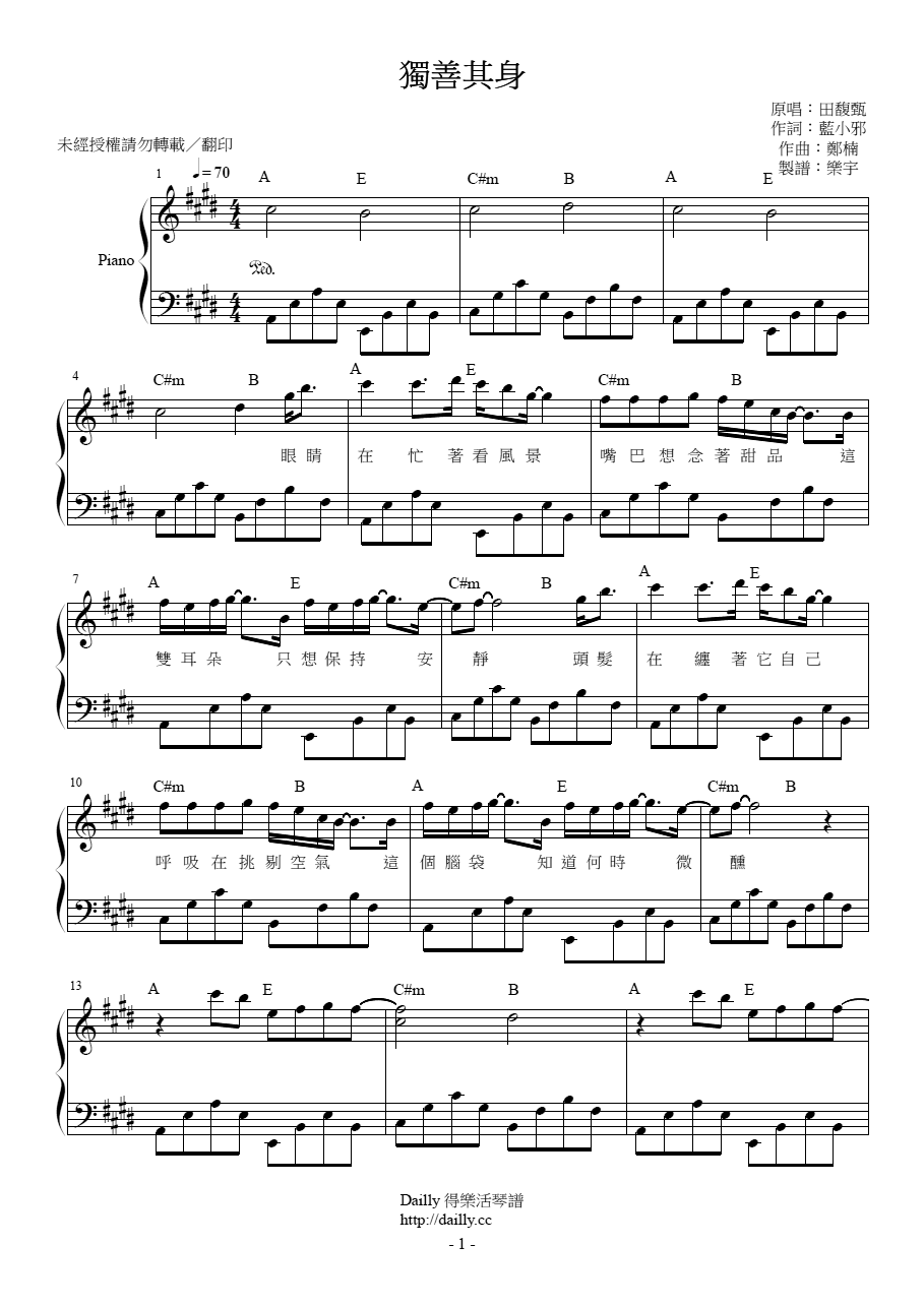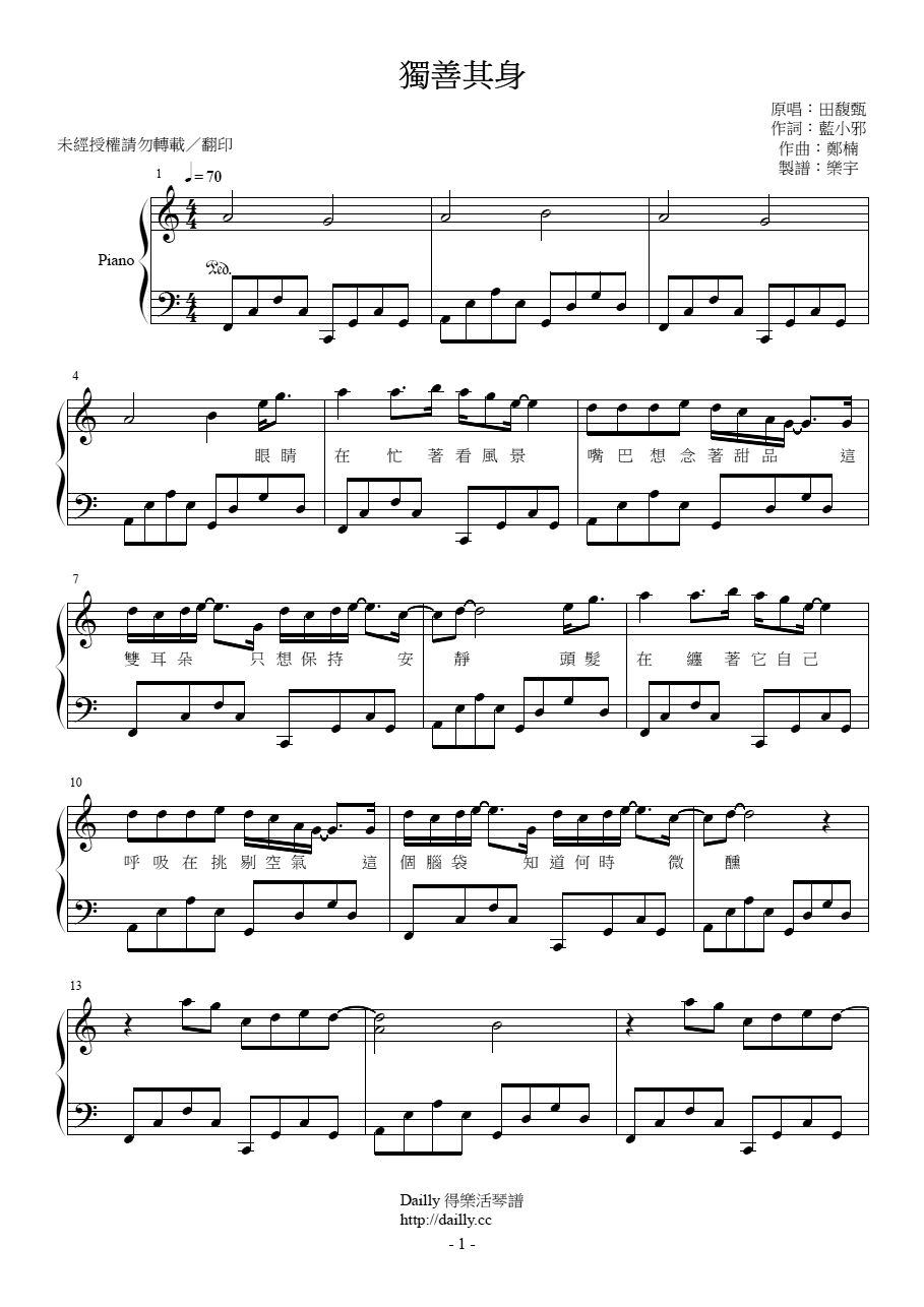 琴譜名稱:田馥甄-獨善其身 鋼琴譜