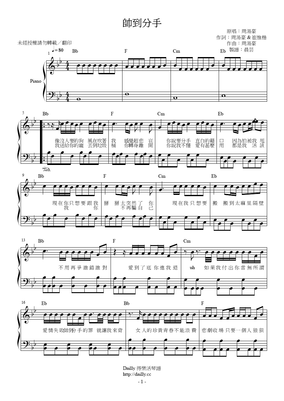 「帥到分手」鋼琴譜現已可在 Dailly 得樂活下載。