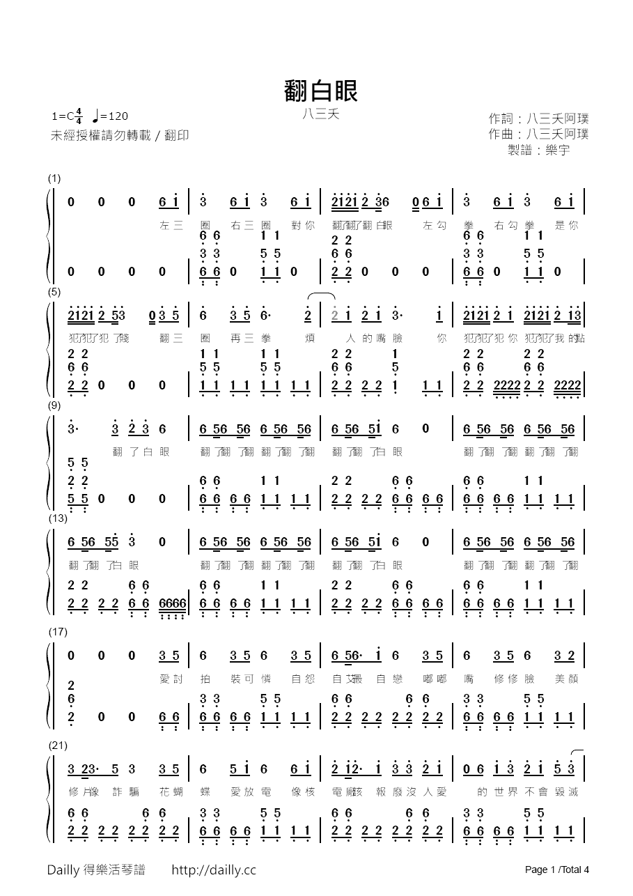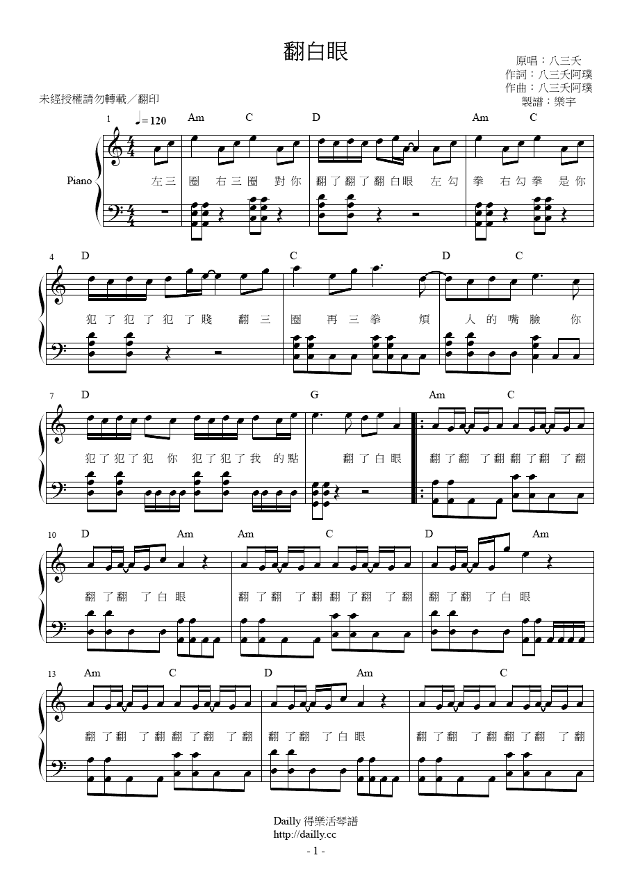 琴譜名稱:八三夭-翻白眼 鋼琴譜