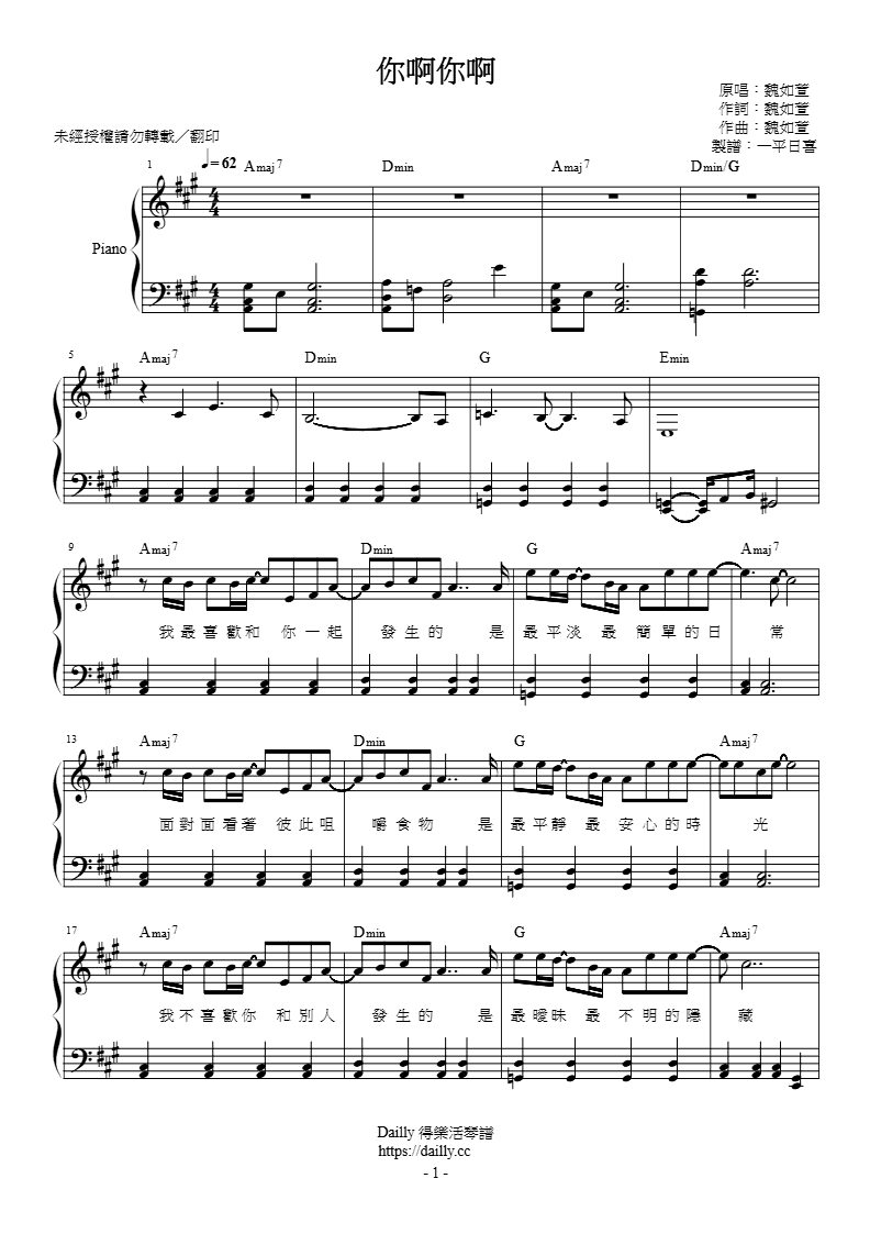 琴譜名稱:魏如萱-你啊你啊 鋼琴譜