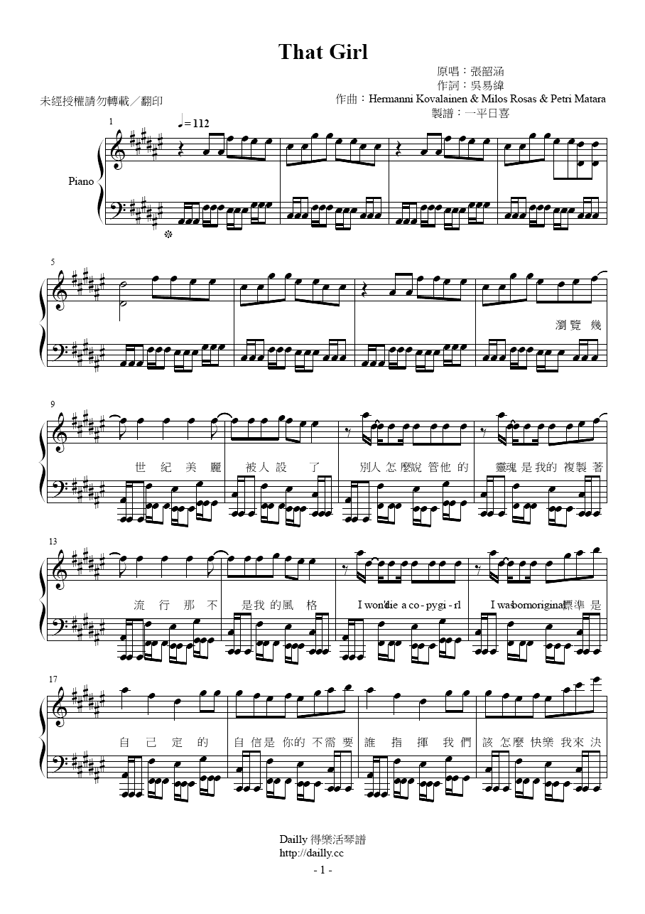 張韶涵 2012 歌曲「That Girl」鋼琴譜。