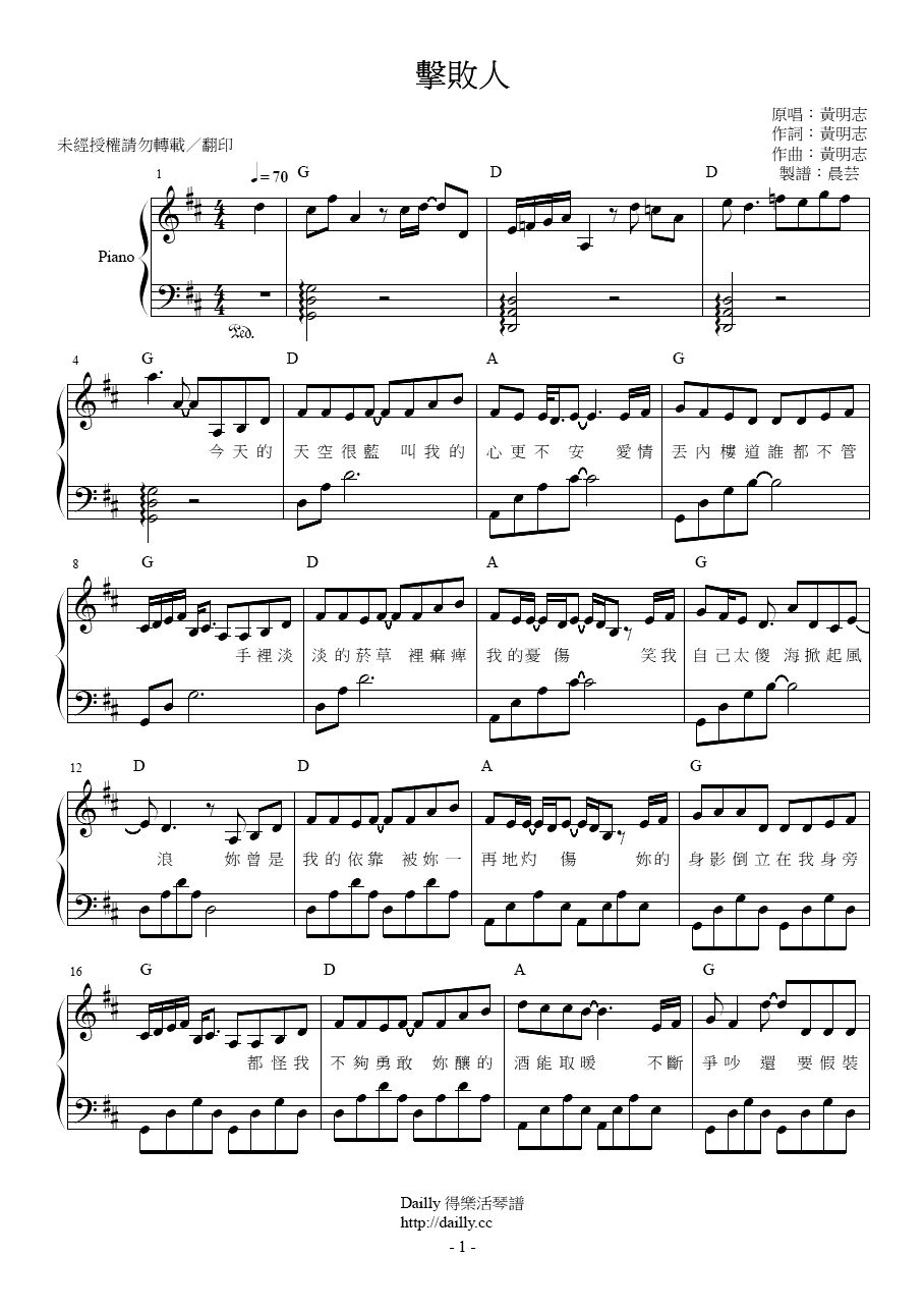 琴譜名稱:黃明志-擊敗人 鋼琴譜