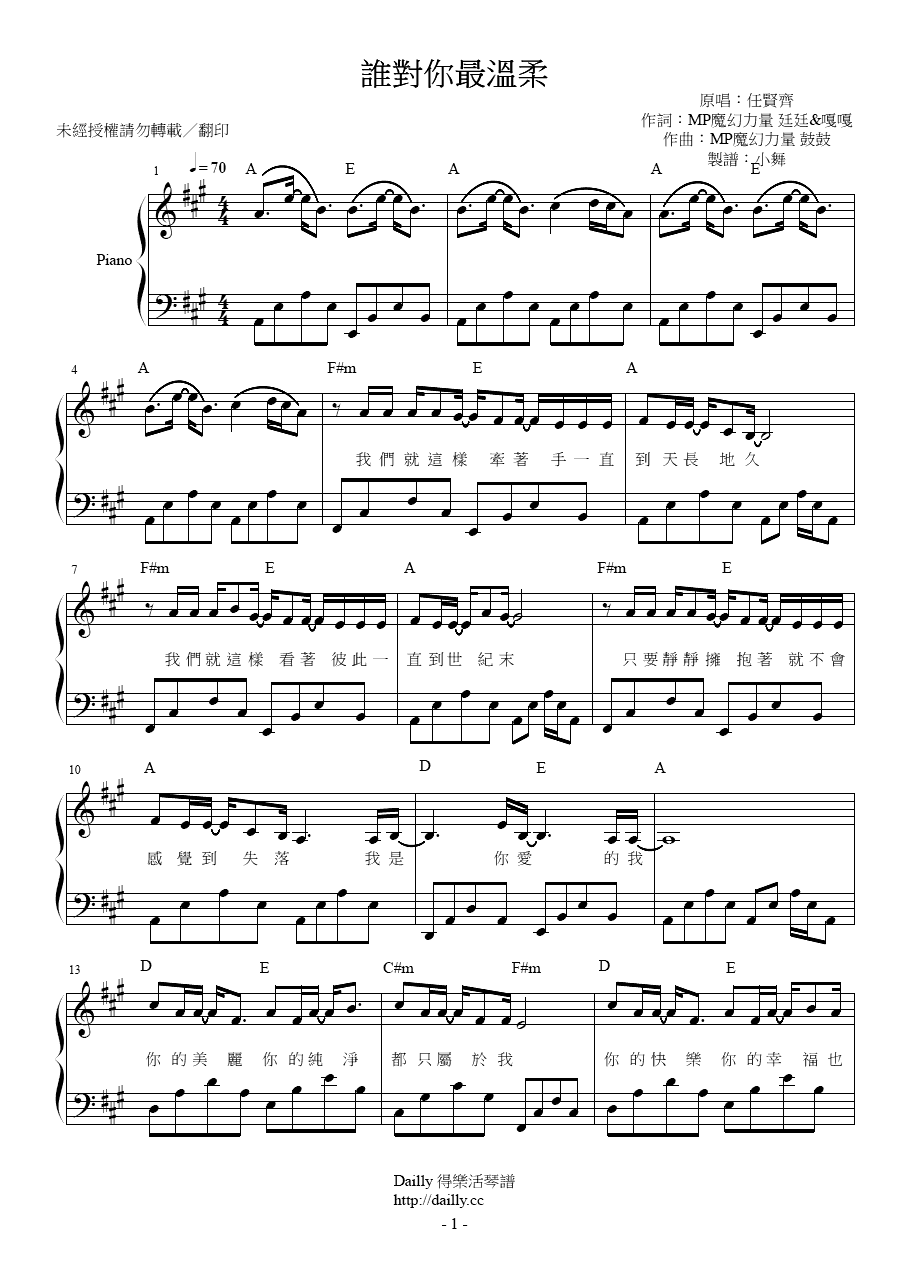 琴譜名稱:任賢齊-誰對你最溫柔 鋼琴譜