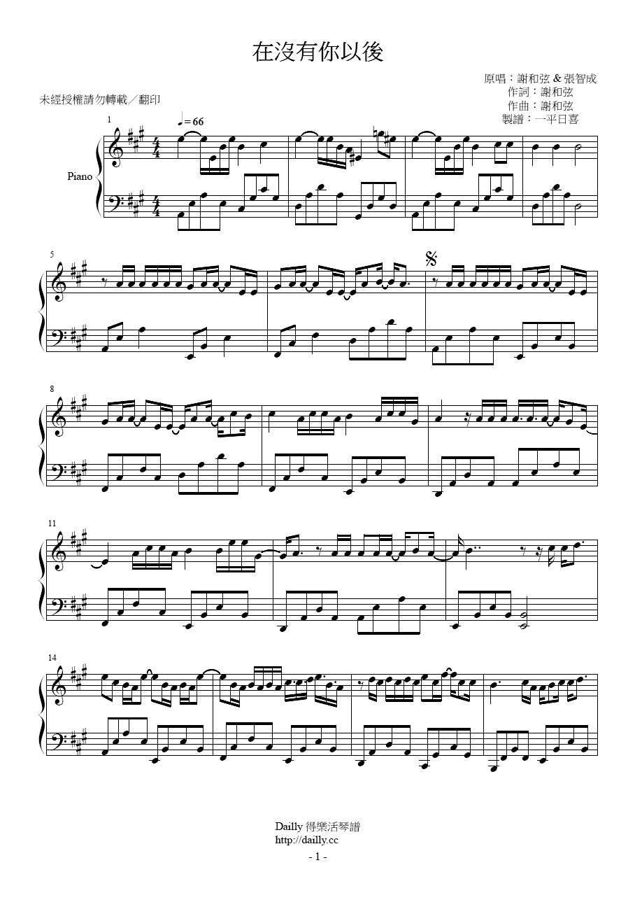 琴譜名稱:謝和弦、張智成-在沒有你以後 鋼琴譜