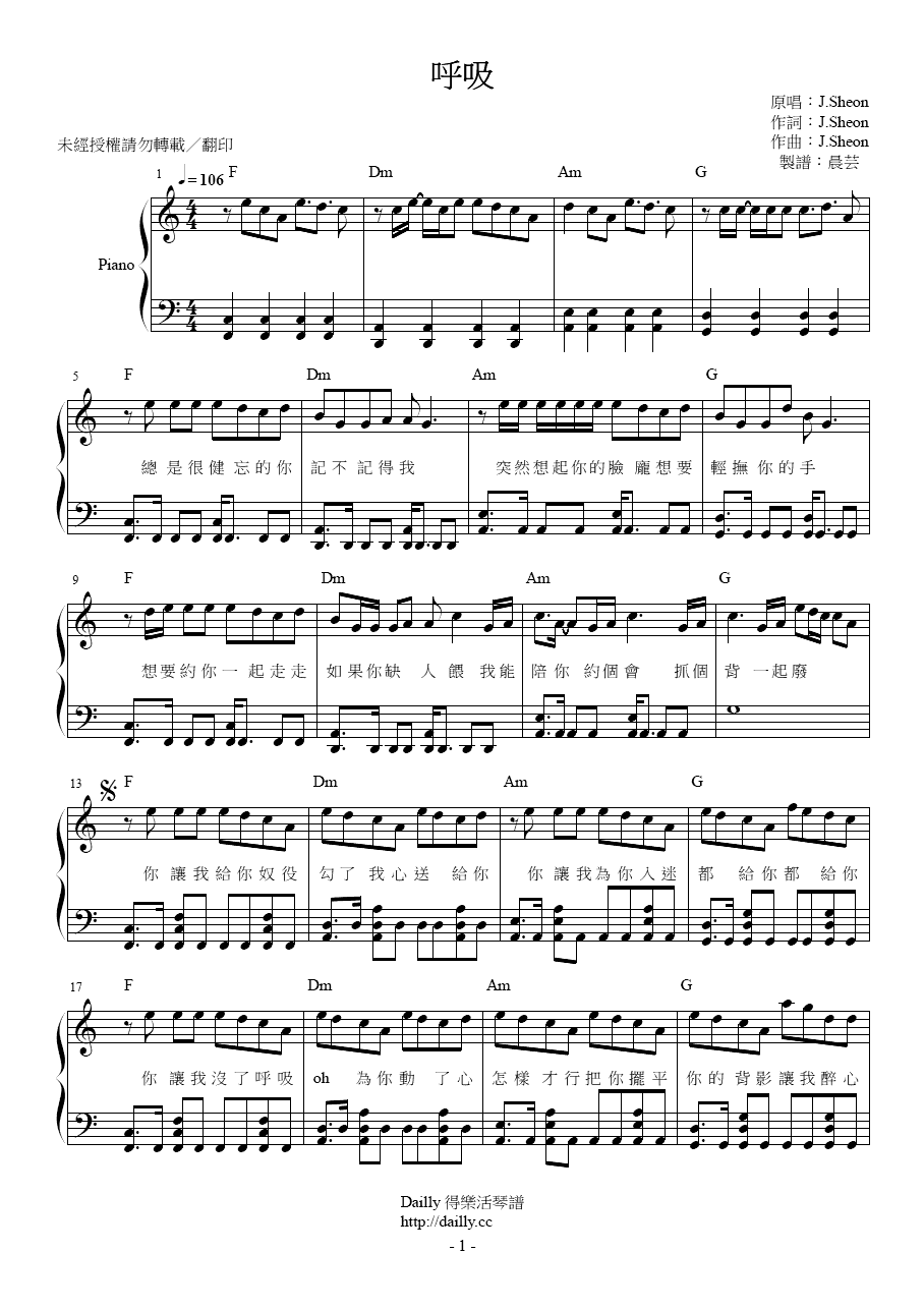 琴譜名稱:J.Sheon-呼吸 鋼琴譜