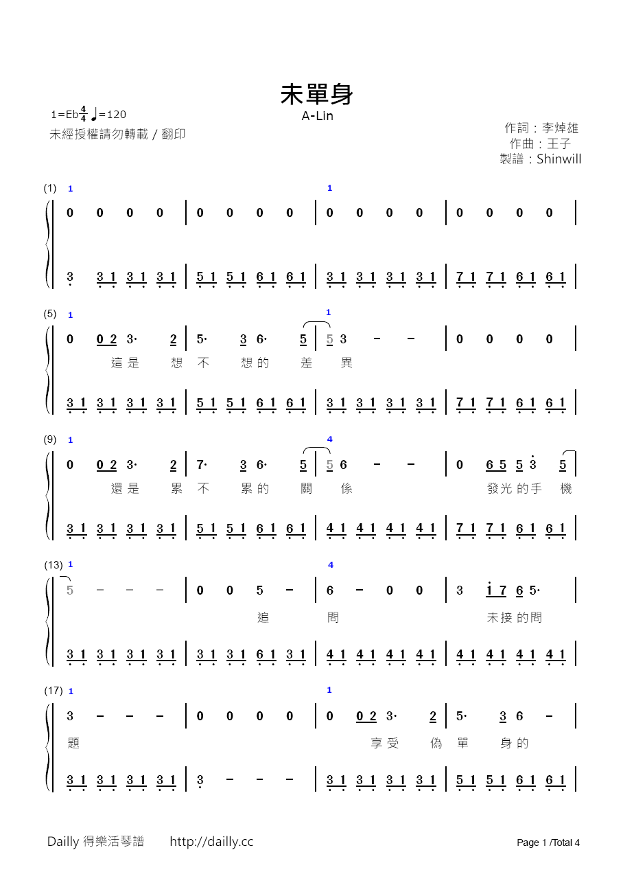 琴譜名稱:A-Lin-未單身 鋼琴譜