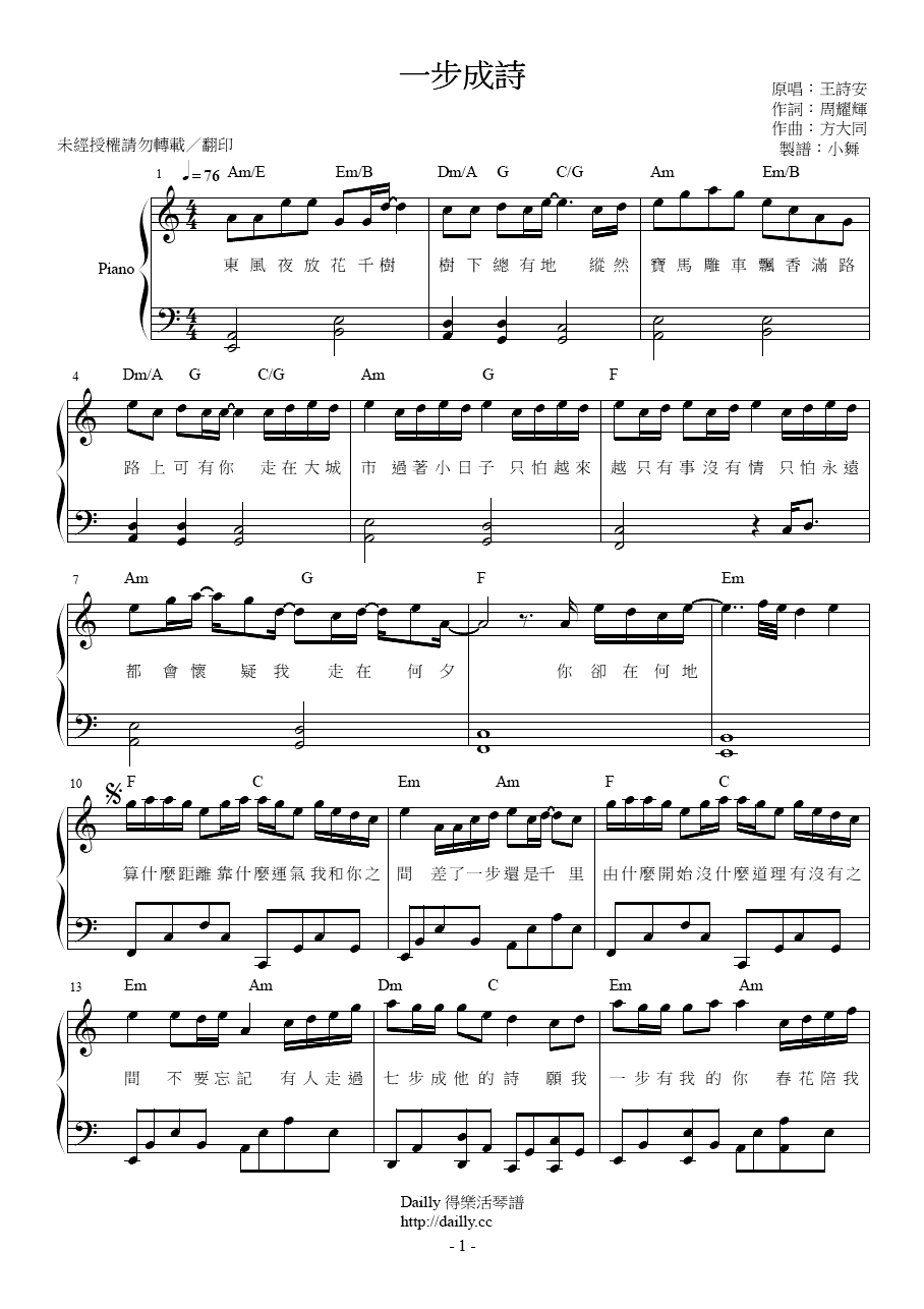 琴譜名稱:王詩安-一步成詩 鋼琴譜