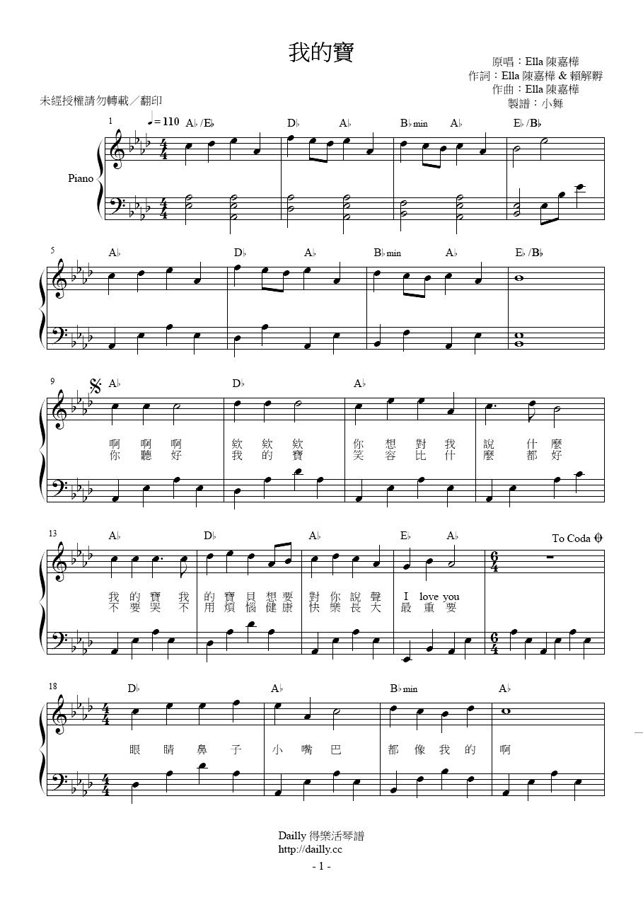 琴譜名稱:Ella 陳嘉樺-我的寶 鋼琴譜
