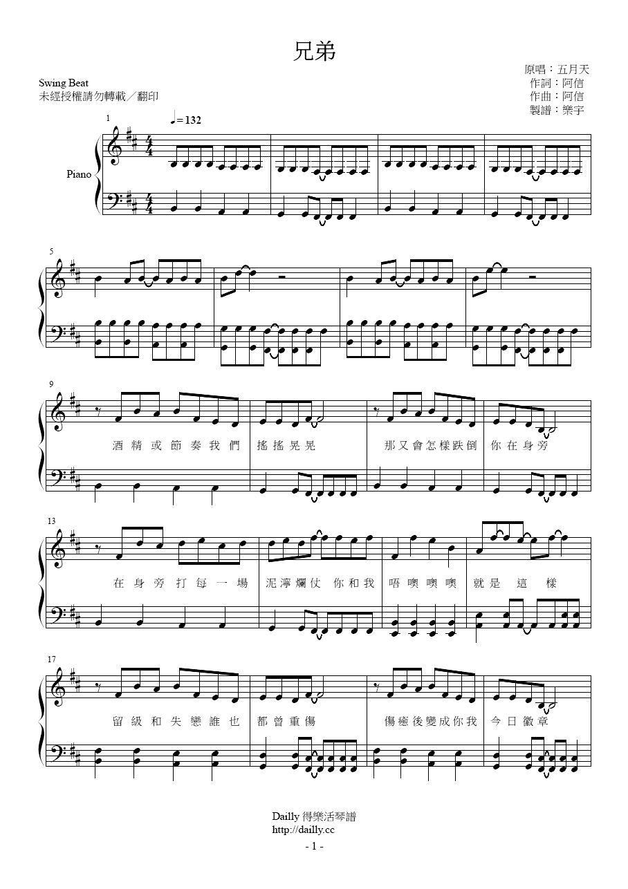 琴譜名稱:五月天-兄弟 鋼琴譜