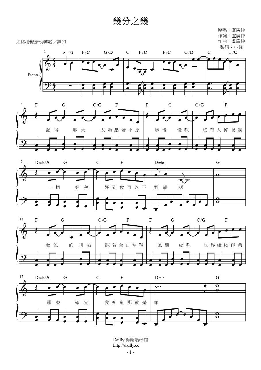 琴譜名稱:盧廣仲-幾分之幾 鋼琴譜