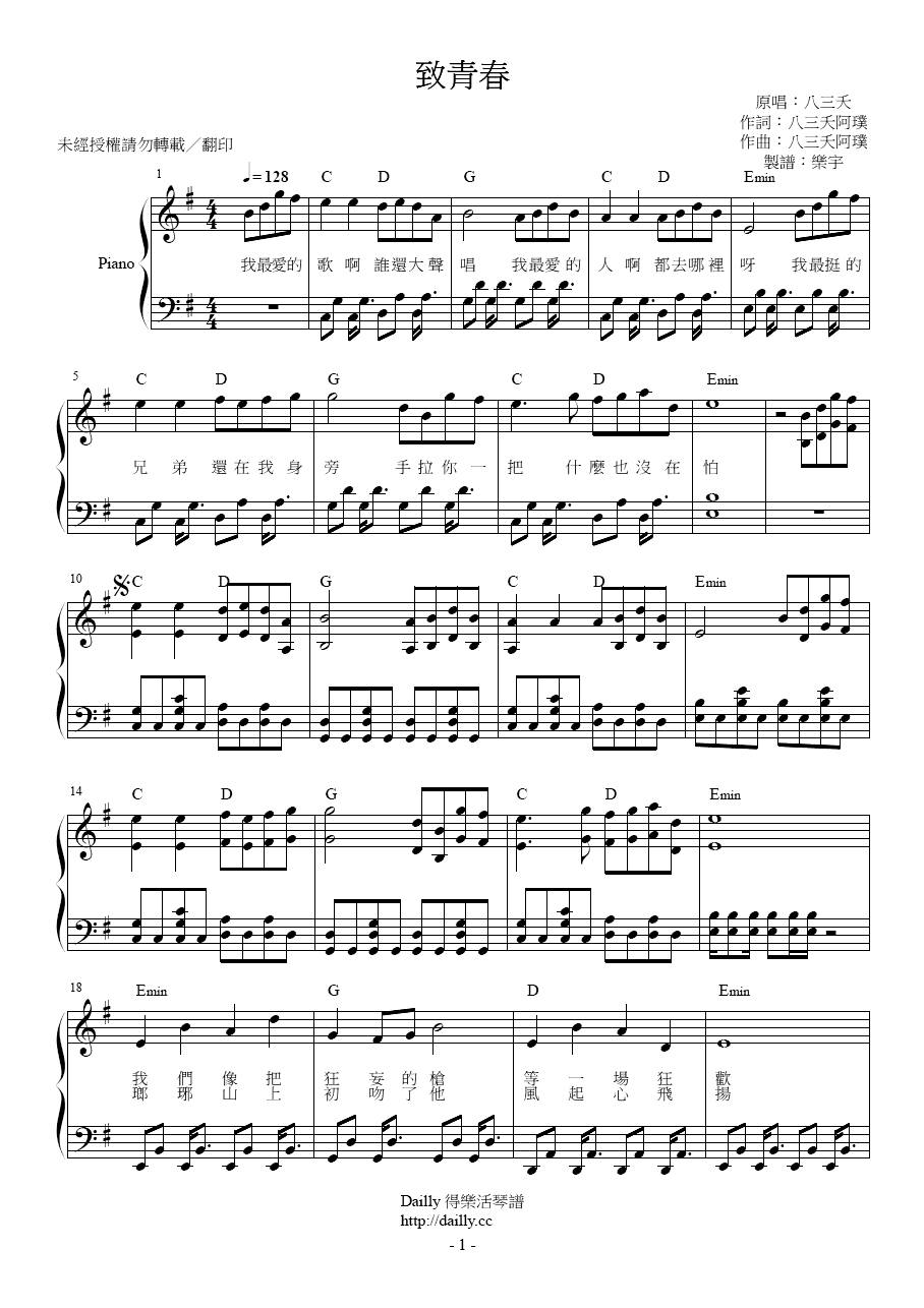 琴譜名稱:八三夭-致青春 鋼琴譜