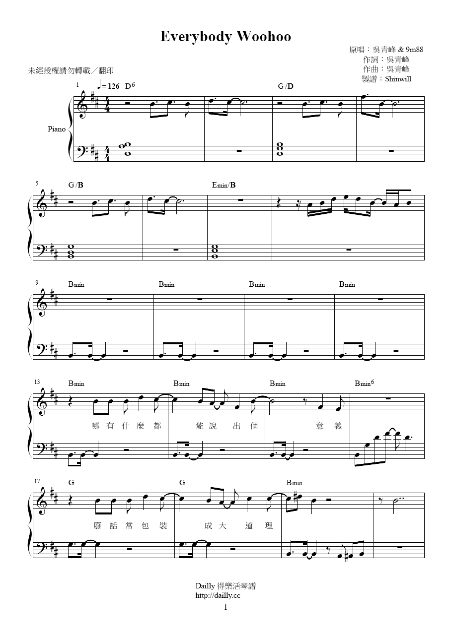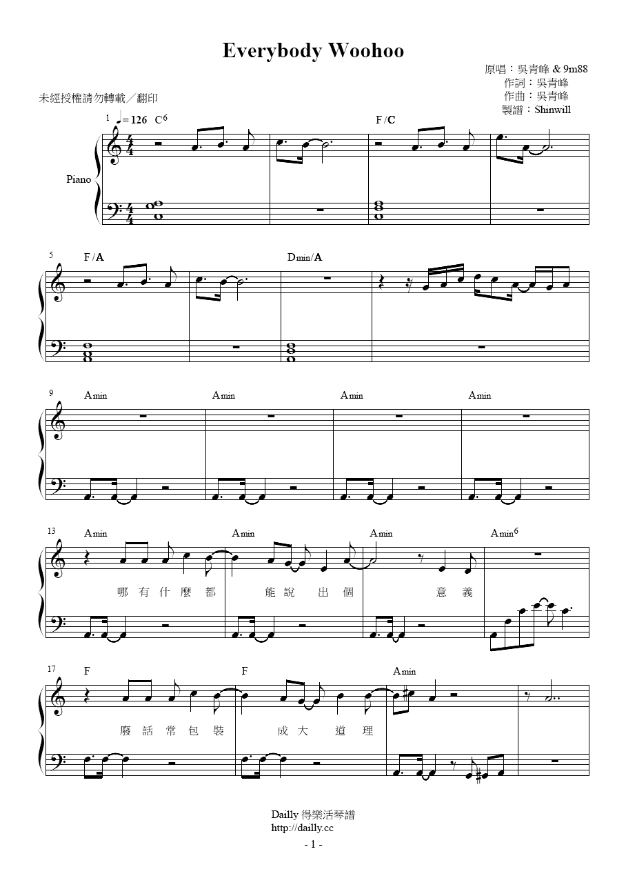 琴譜名稱:吳青峰、9m88-Everybody Woohoo 鋼琴譜