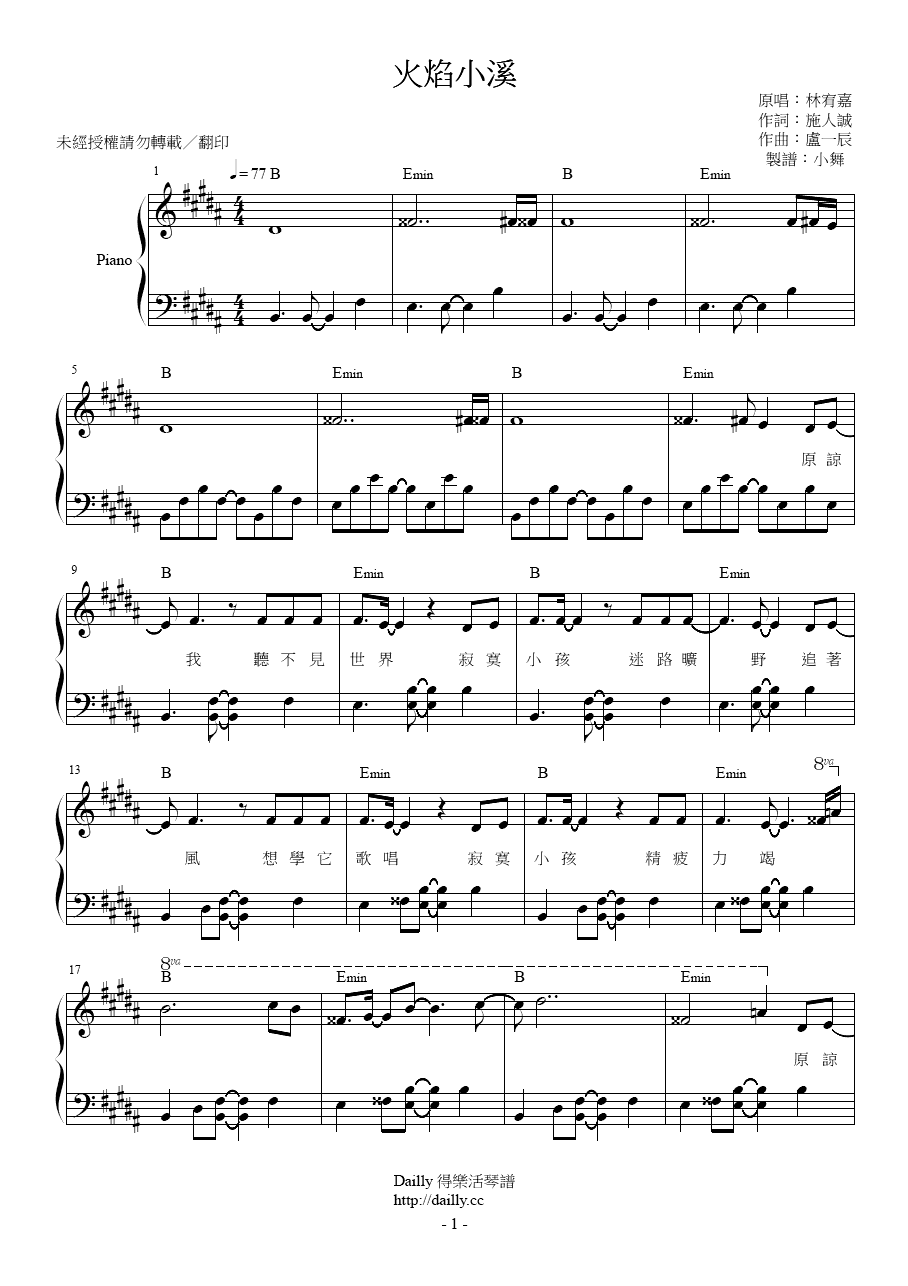 琴譜名稱:林宥嘉-火焰小溪 鋼琴譜