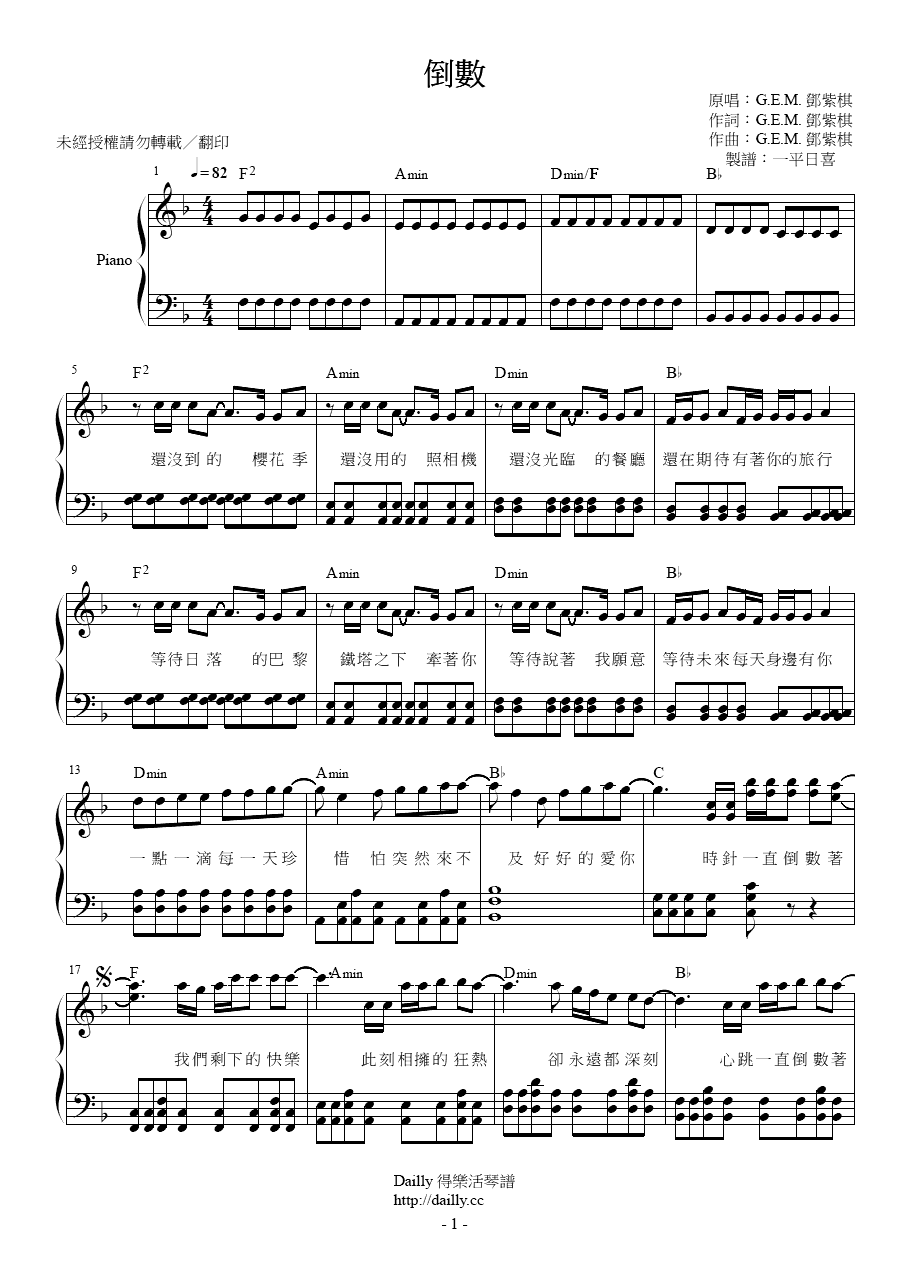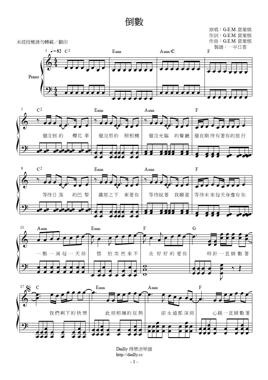 琴譜名稱:G.E.M. 鄧紫棋-倒數 鋼琴譜