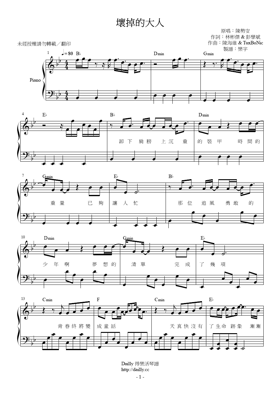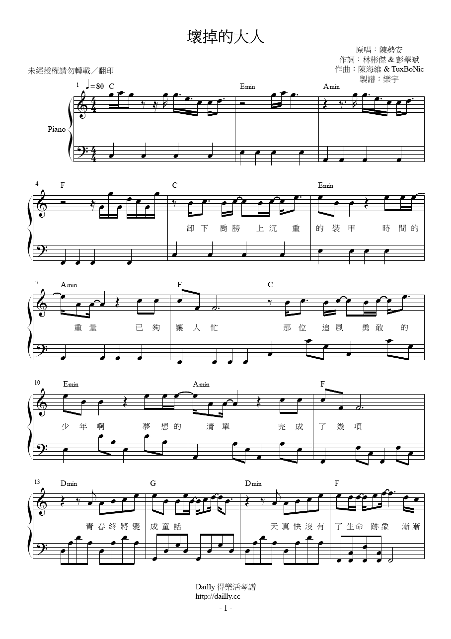 琴譜名稱:陳勢安-壞掉的大人 鋼琴譜