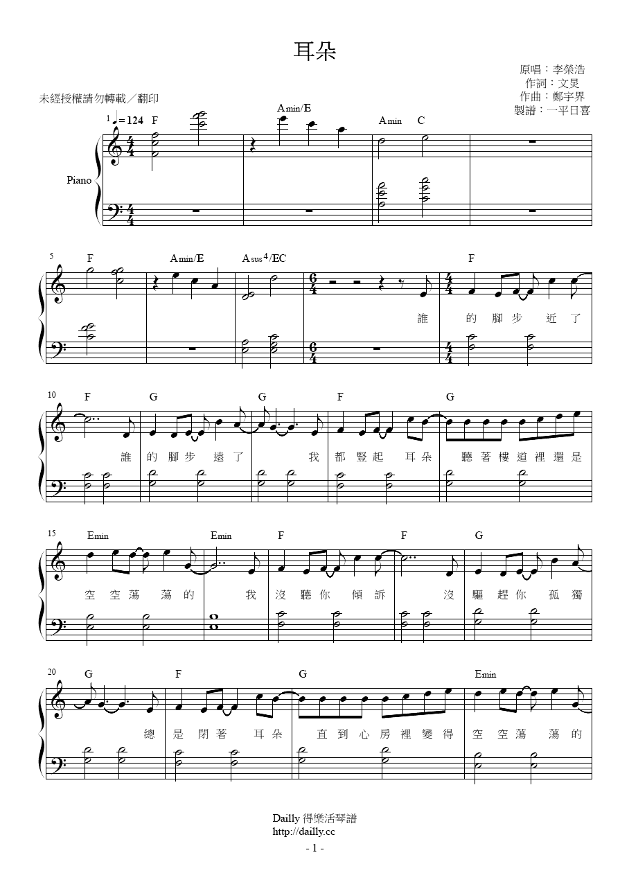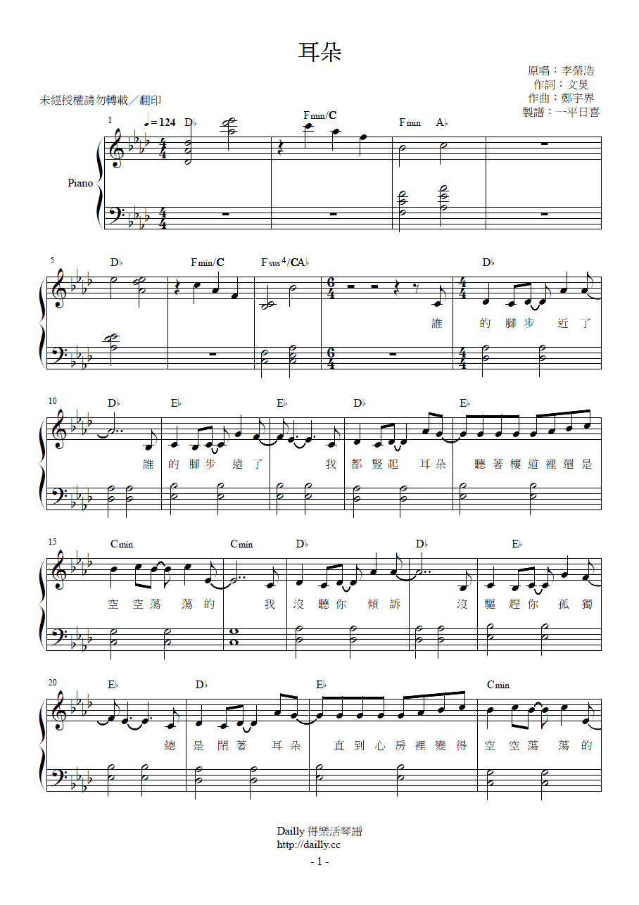 琴譜名稱:李榮浩-耳朵 鋼琴譜
