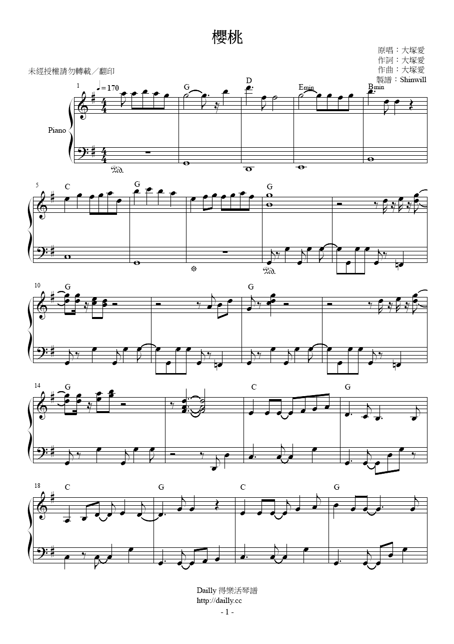 琴譜名稱:大塚愛-櫻桃 鋼琴譜