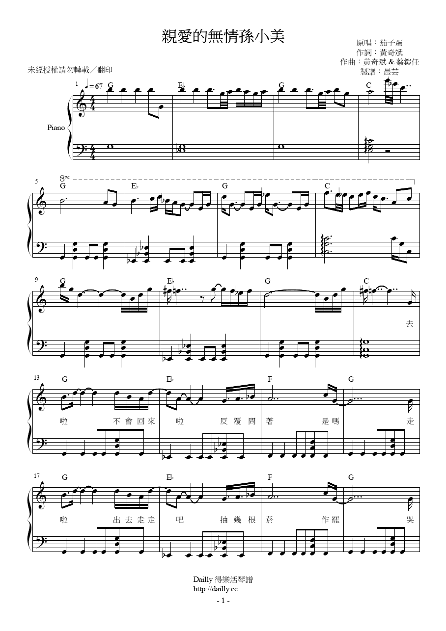 琴譜名稱:茄子蛋-親愛的無情孫小美 鋼琴譜