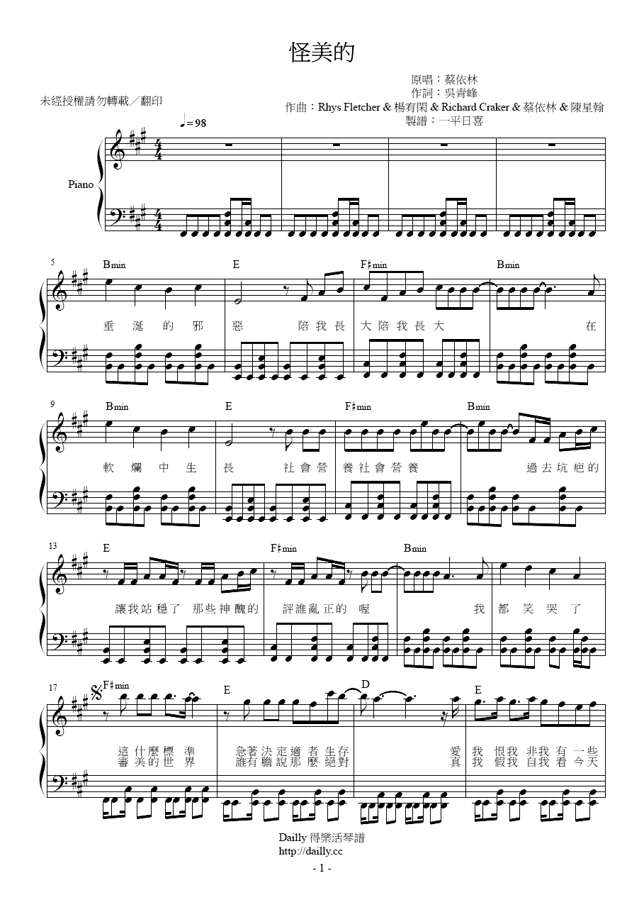 琴譜名稱:蔡依林-怪美的 鋼琴譜