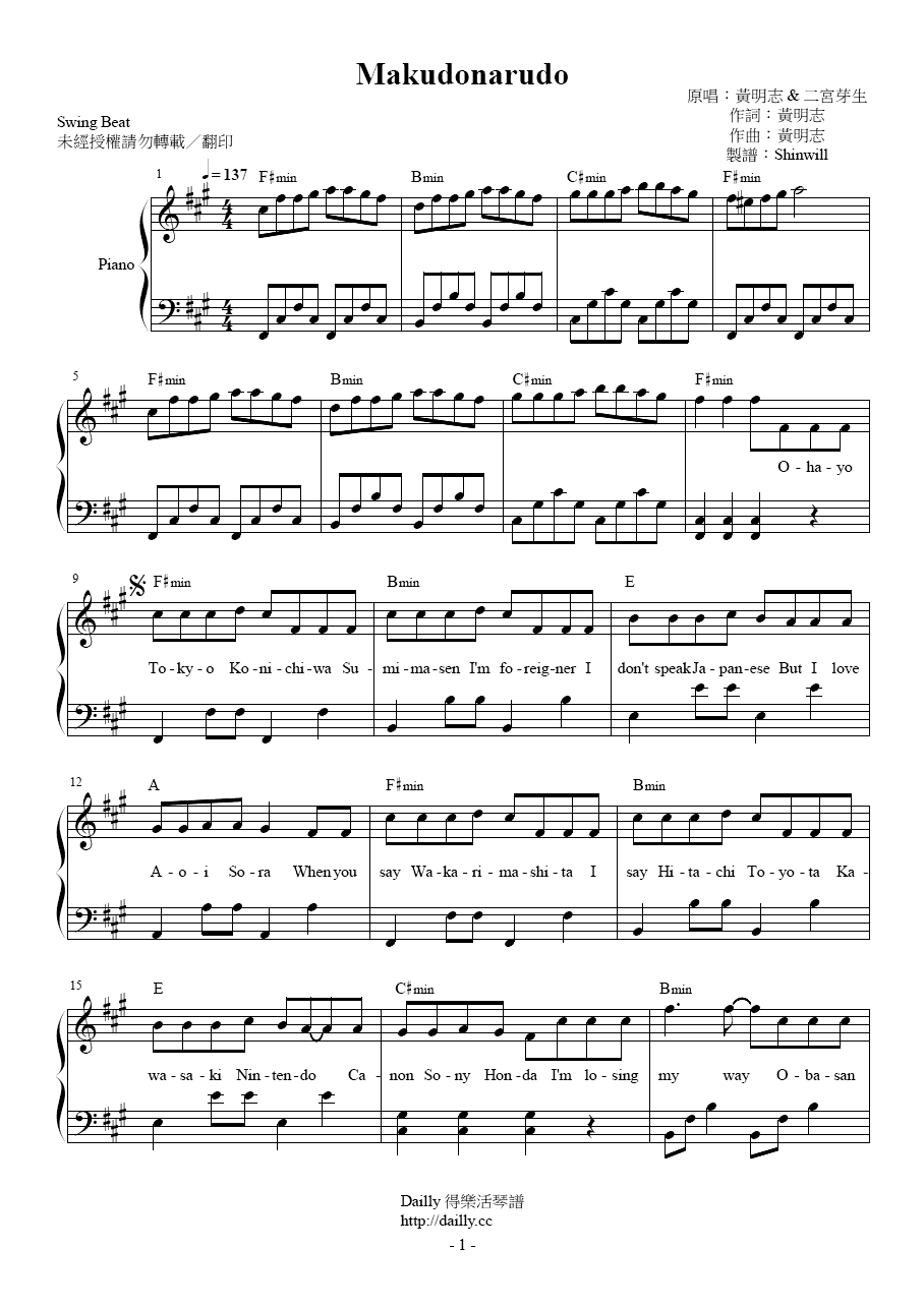 琴譜名稱:黃明志、二宮芽生-Makudonarudo 鋼琴譜