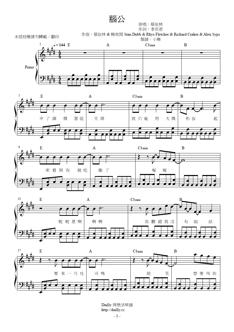 琴譜名稱:蔡依林-腦公 鋼琴譜