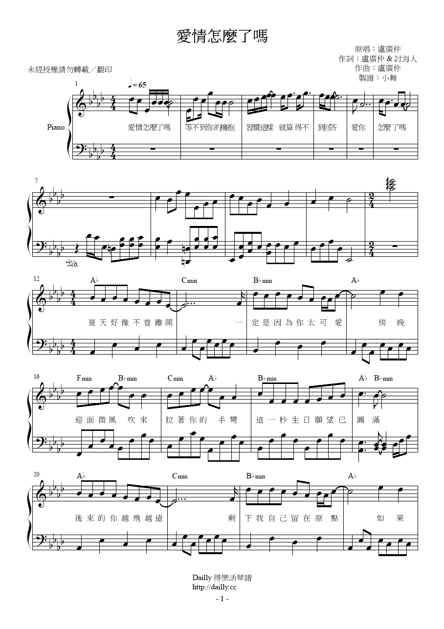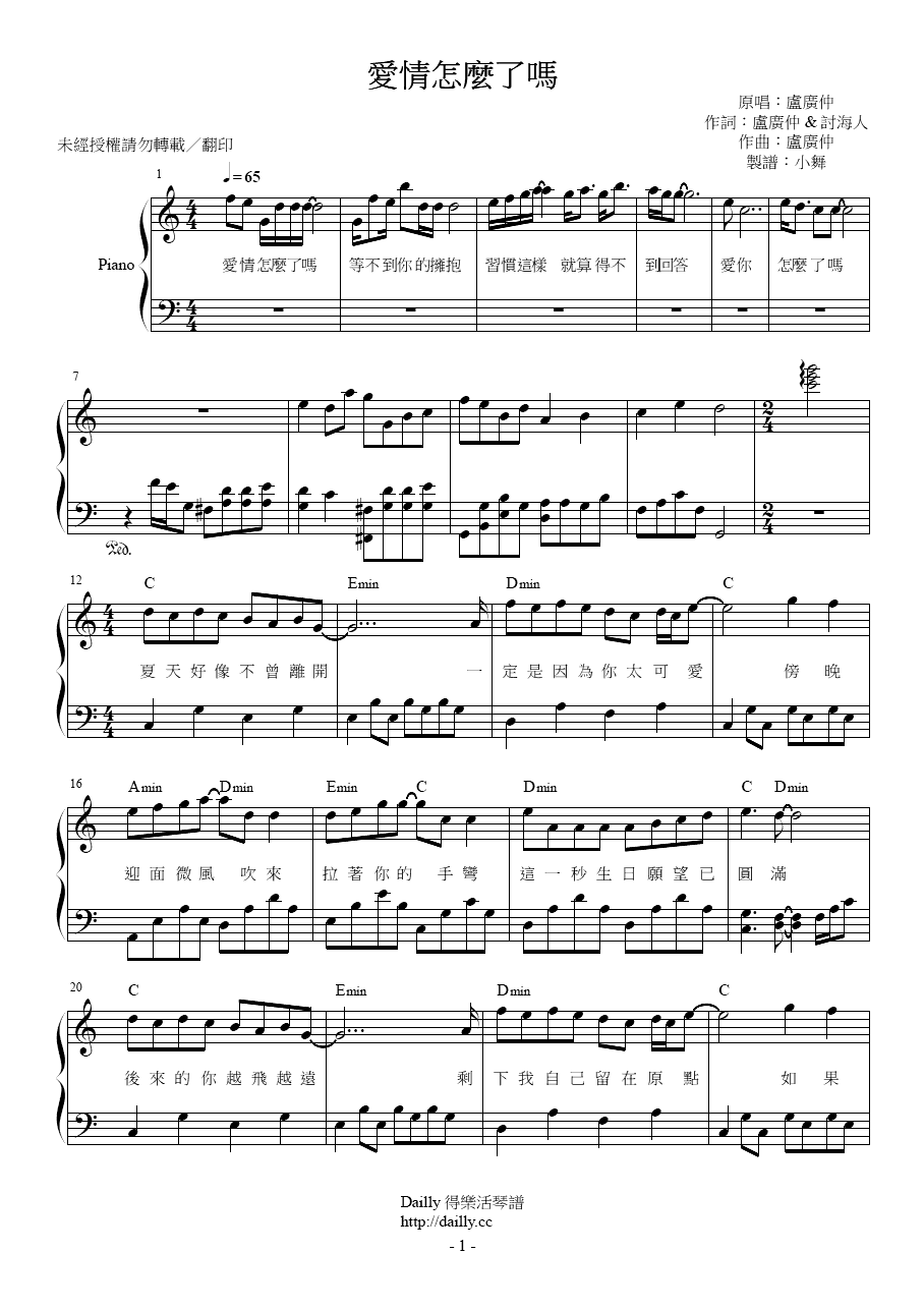 琴譜名稱:盧廣仲-愛情怎麼了嗎 鋼琴譜
