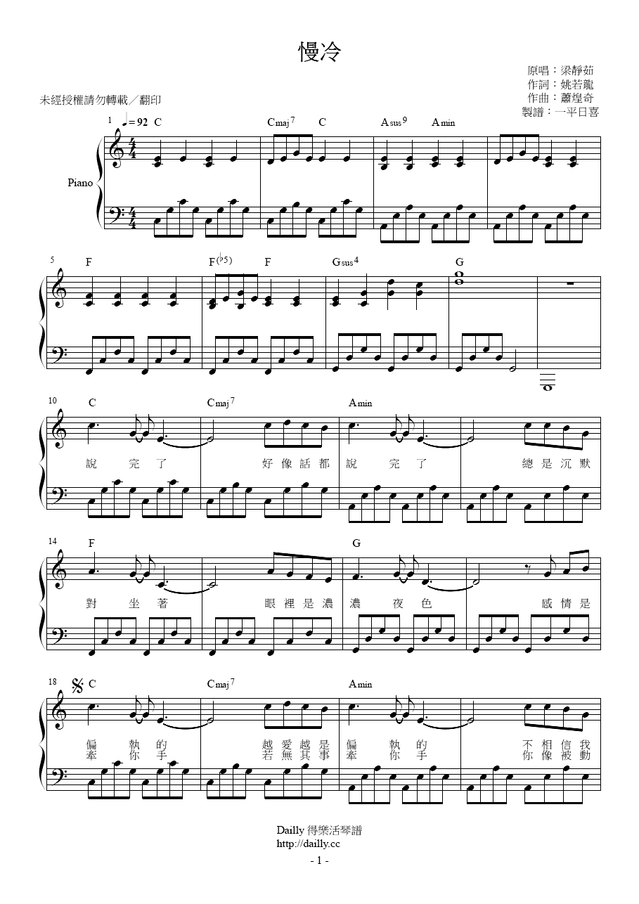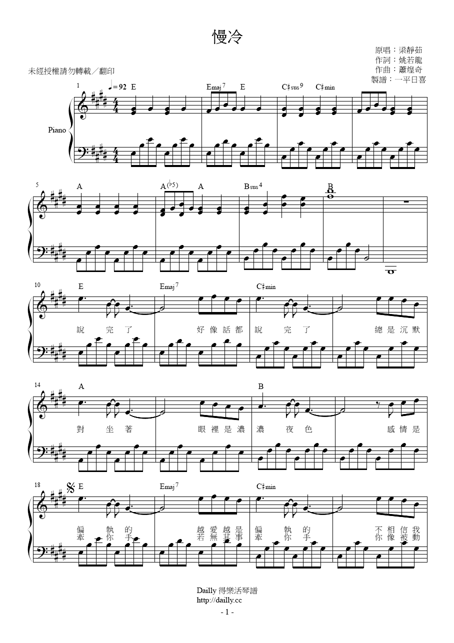琴譜名稱:梁靜茹-慢冷 鋼琴譜