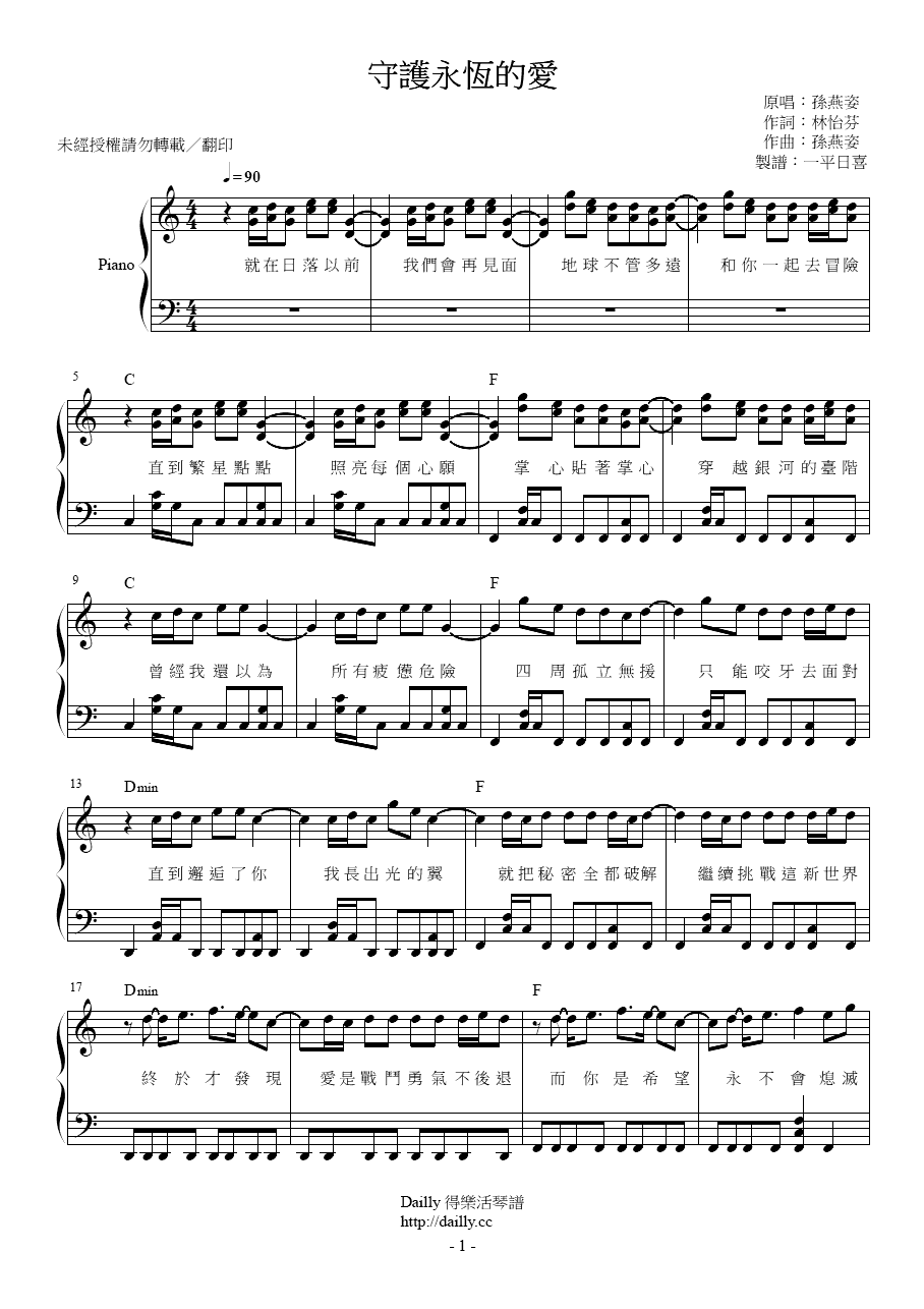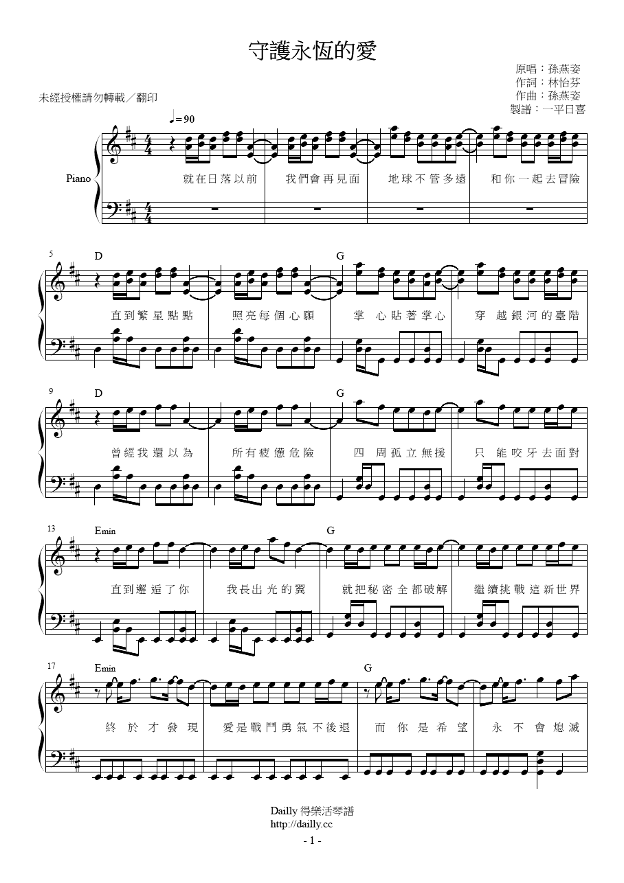 琴譜名稱:孫燕姿-守護永恆的愛 鋼琴譜