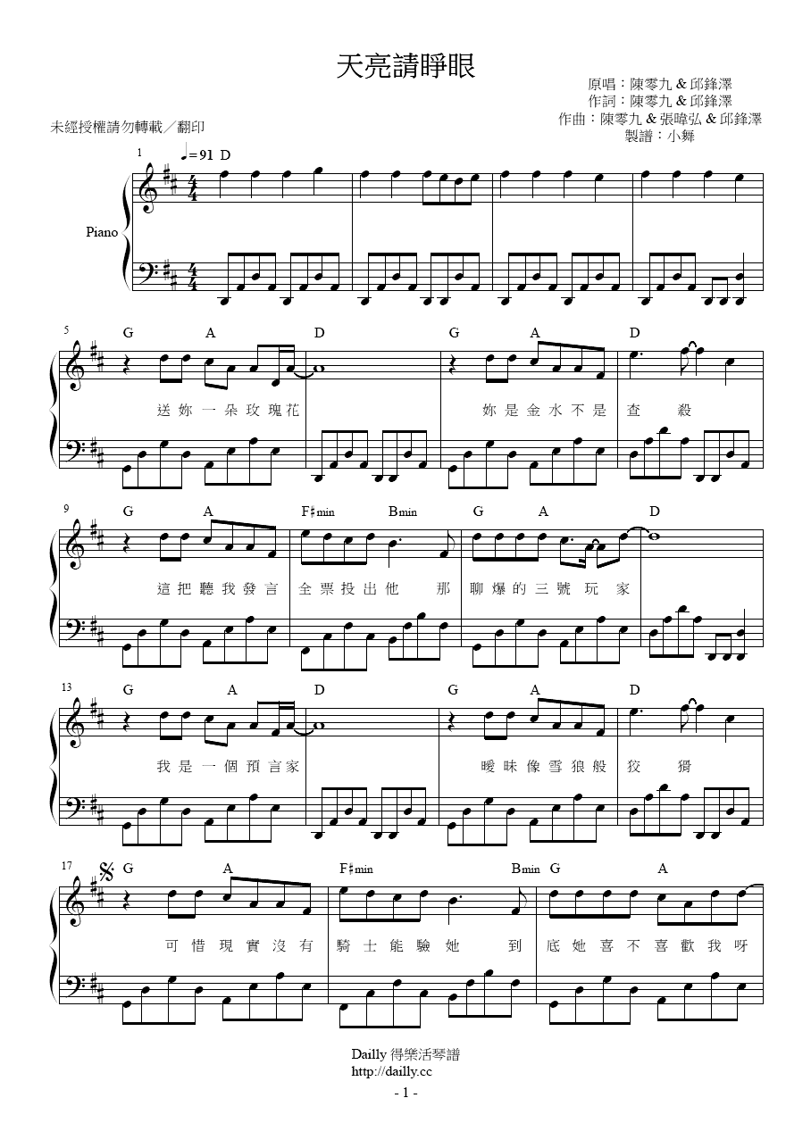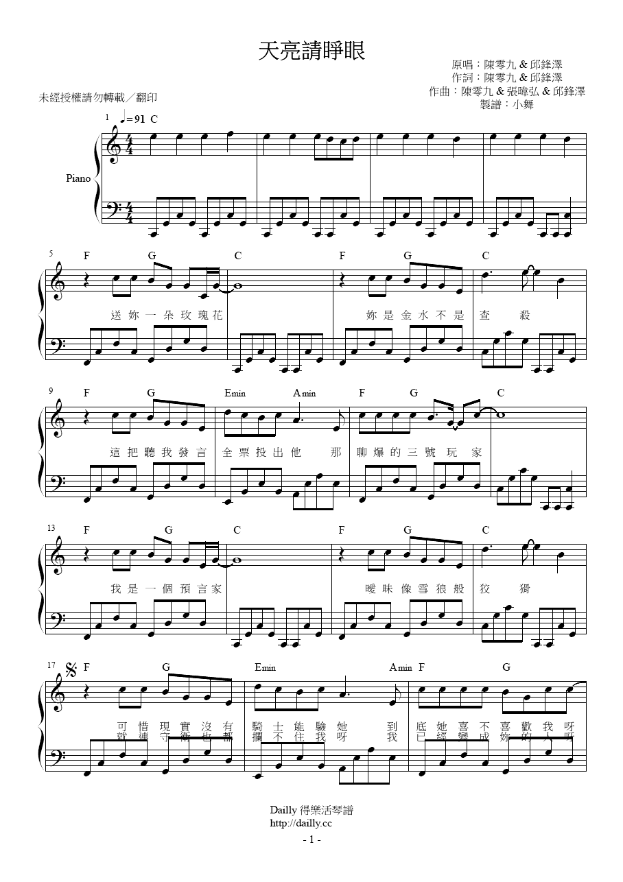 琴譜名稱:陳零九、邱鋒澤-天亮請睜眼 鋼琴譜