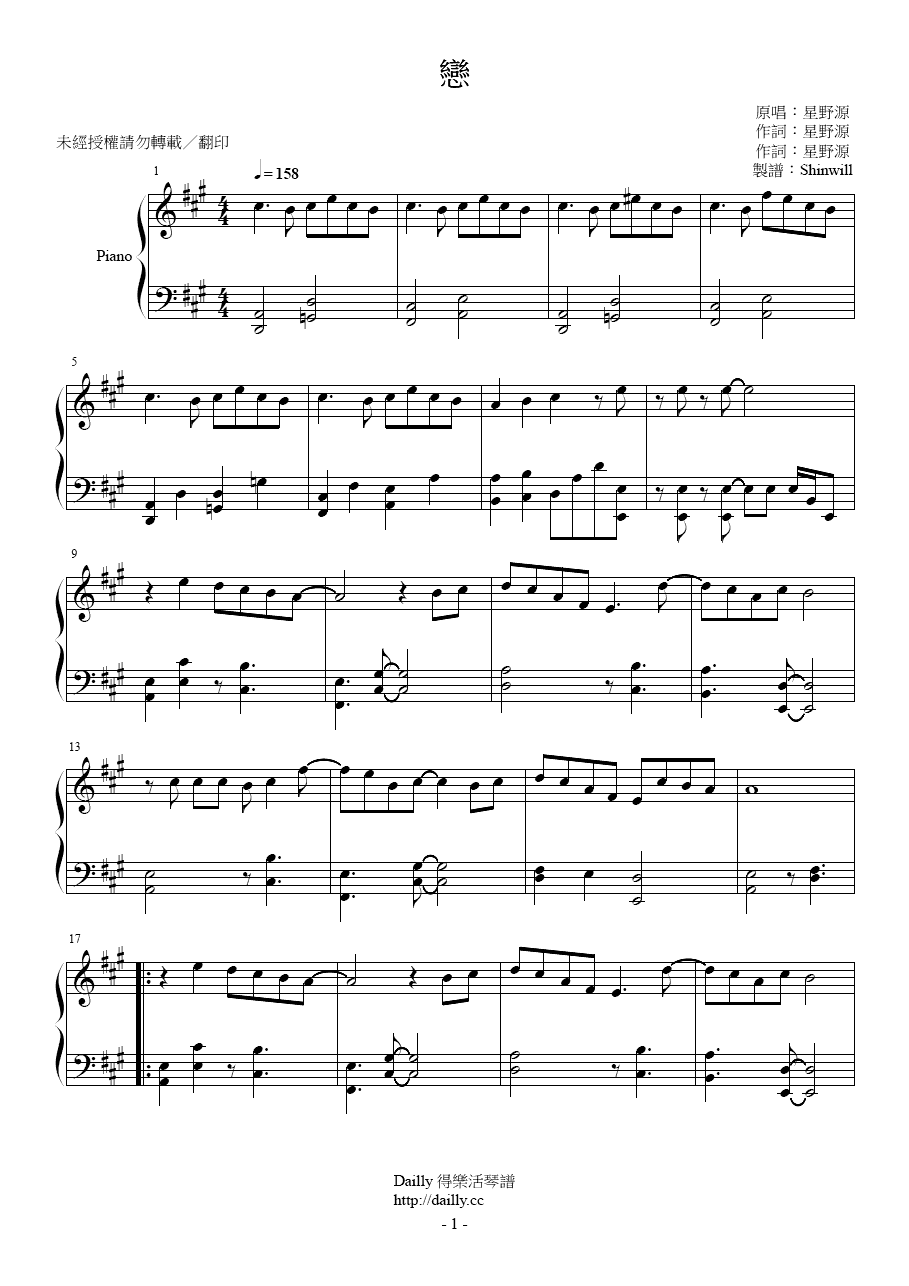 琴譜名稱:星野源-戀 鋼琴譜