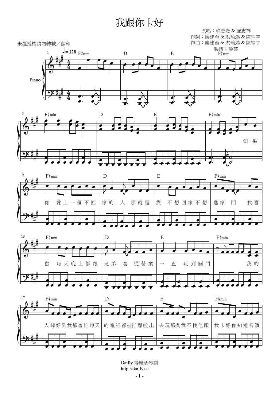 琴譜名稱:玖壹壹、羅志祥-我跟你卡好 鋼琴譜