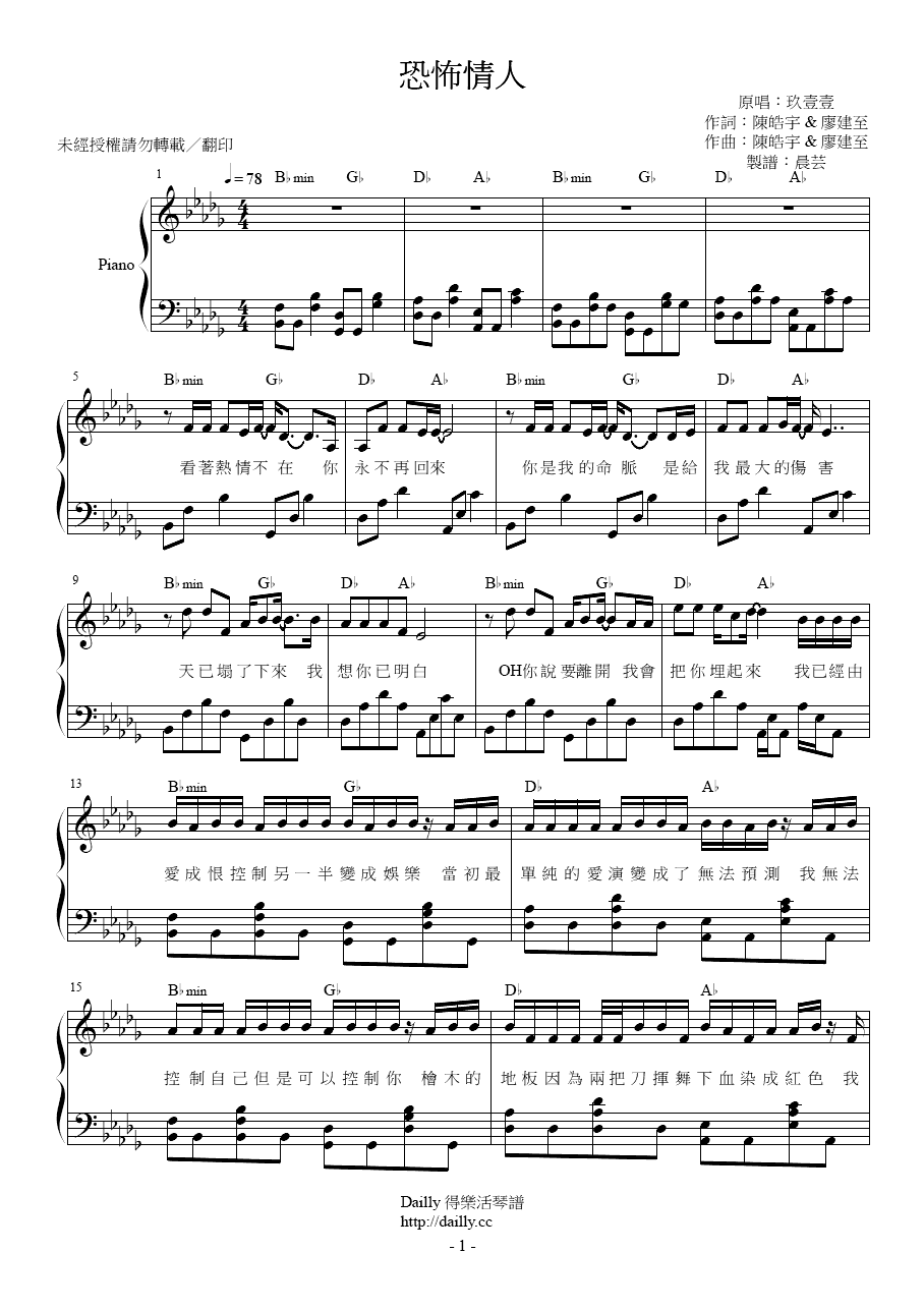 琴譜名稱:玖壹壹-恐怖情人 鋼琴譜
