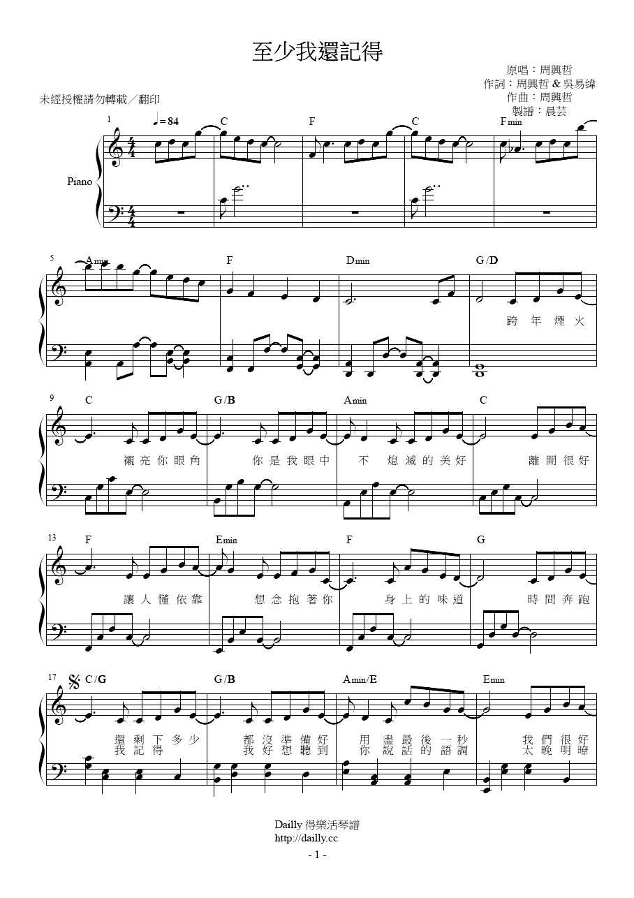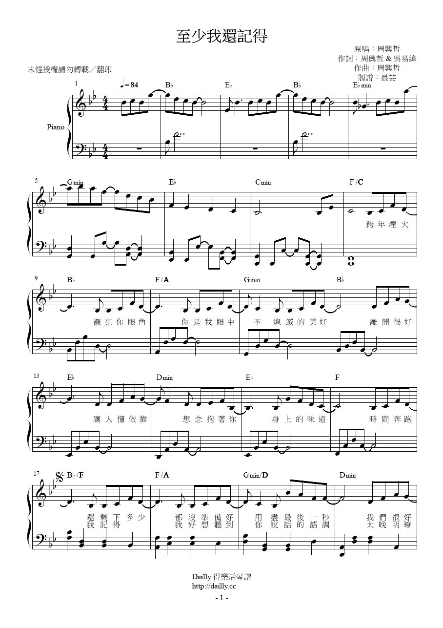 琴譜名稱:周興哲-至少我還記得 鋼琴譜