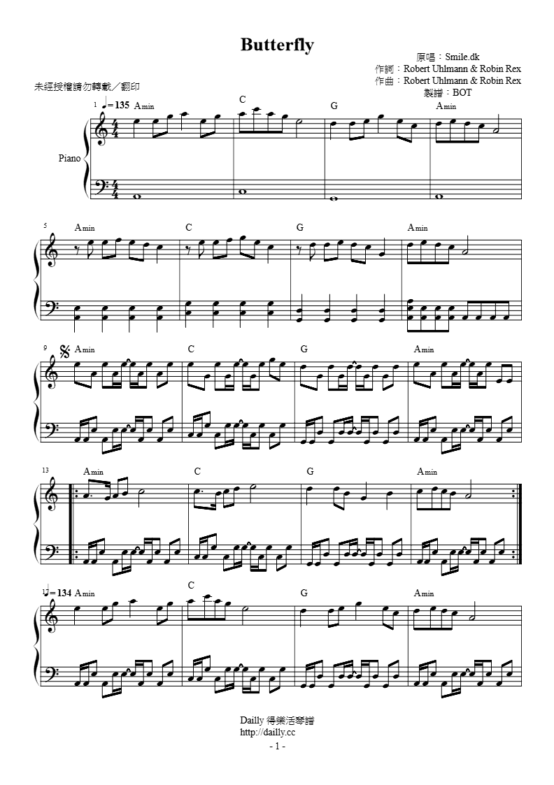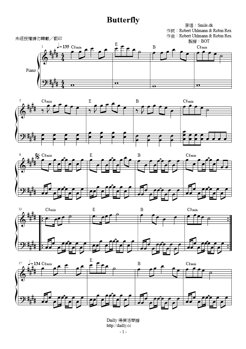 琴譜名稱:Smile.dk-Butterfly 鋼琴譜
