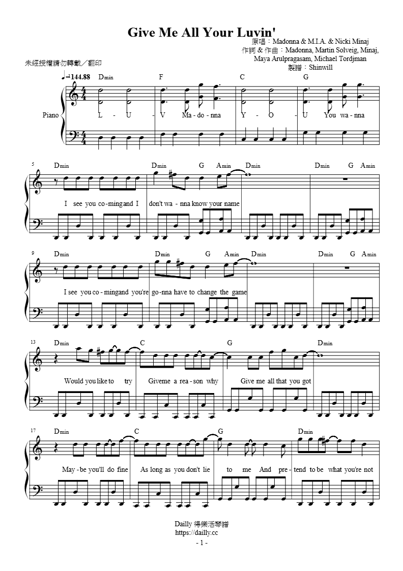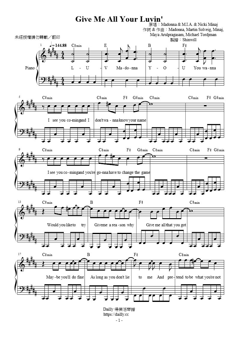 琴譜名稱:Madonna、M.I.A.、Nicki Minaj-Give Me All Your Luvin' 鋼琴譜