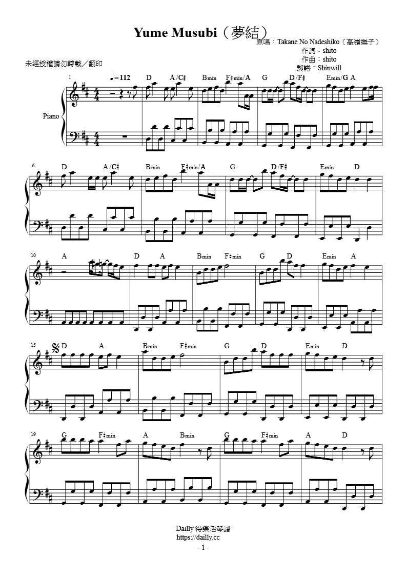 如果您的主題顏色選用深色模式,以下琴譜預覽會顯示反相顏色,