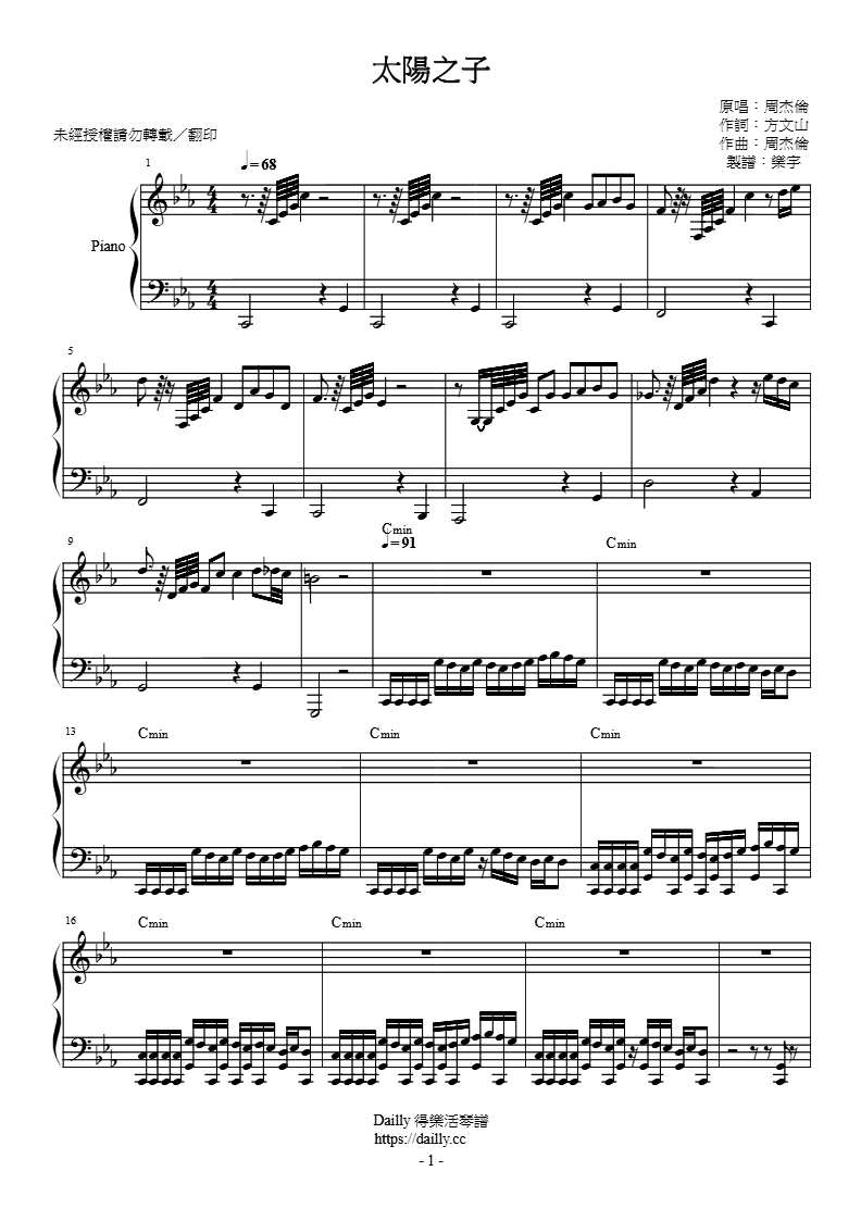 琴譜名稱:周杰倫-太陽之子 鋼琴譜